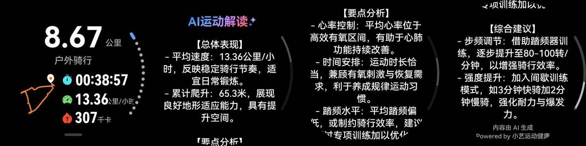 比如这次骑行后,AI 解读直接提醒我 “平均踏频偏低”,还给出了具体建议 ——“借助踏频器训练 + 加入间歇训练”,帮我明确了接下来的提升方向。以前骑行总像 “盲目锻炼”,不知道自己哪里需要改进,而有了这款手表的专业分析,骑行不再是单纯的 “动一动”,反而变成了有目标、有方法的提升过程,让我对每次骑行都更有期待。