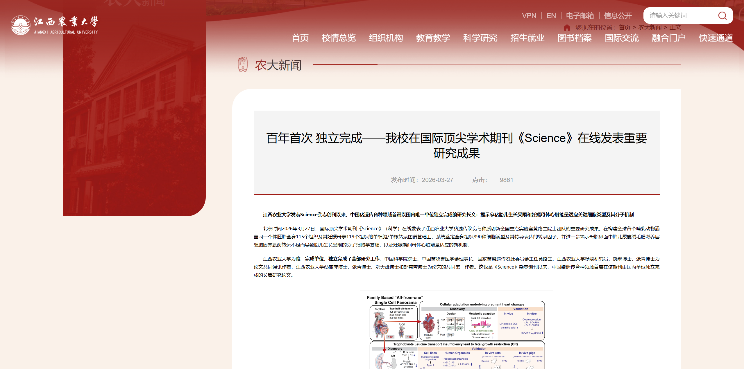 2026年3月, 江西农大猪遗传改良与种质创新全国重点实验室的黄路生院士团队,在《Science》上发表了长篇研究论文,而且是国内单位独立完成的,这在我国猪遗传育种领域还是头一回,更重要的是,黄路生院士作为第一完成人的项目已经通过国家科技进步奖特等奖初评。那特等奖是什么样的概念,一年最多就一个,有些年份还直接没,要是最后真获奖,江西农大的畜牧学就实现了四大满贯。