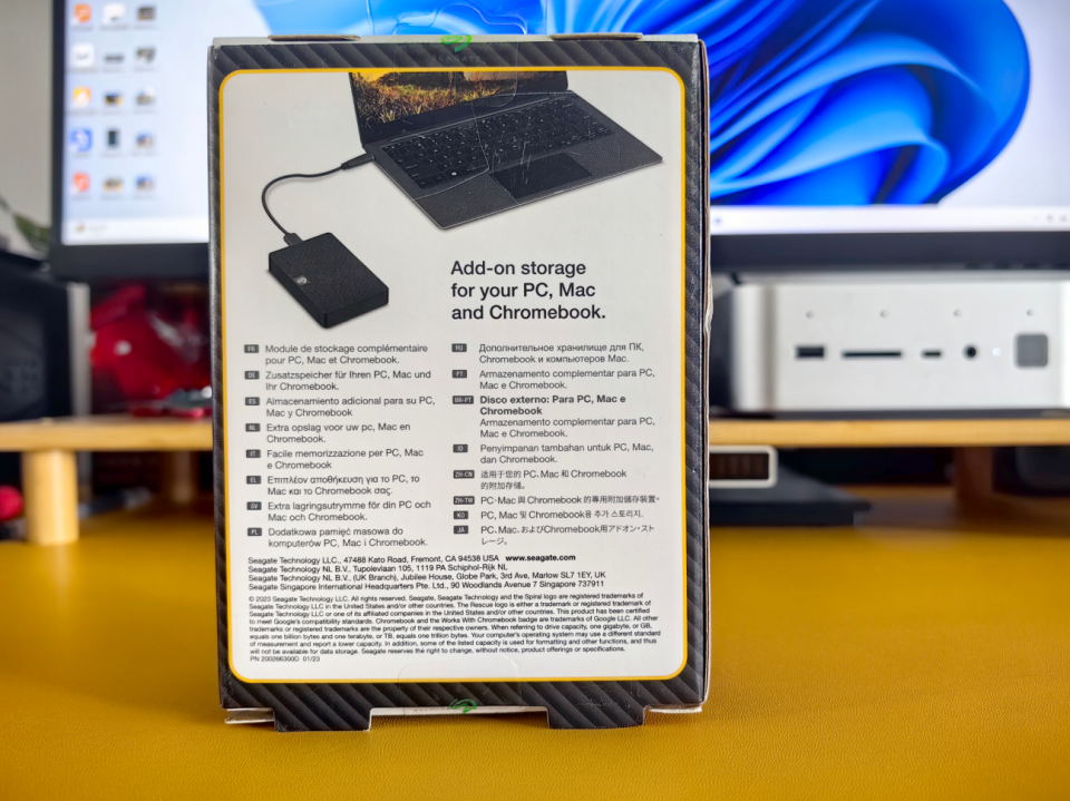 🔺包装正面除了可以看清硬盘实体图,还标注了硬盘的使用场景与容量。使用场景支持Windows主机、Mac,以及Chromebook,容量我选择的是4T。需要说明的是,除了4TB,希捷睿翼移动硬盘还有1T、2T、5T容量的规格可选。