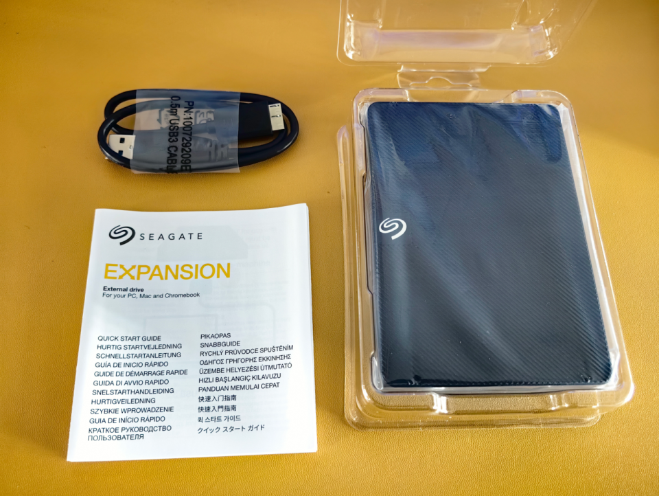 🔺内部附件不多,除了硬盘本体,还标配了一根数据线以及多国语言的说明书。硬盘本体是卡在一个专属的塑料卡槽内,还附有缩封袋,保护措施做的还是挺到位的。