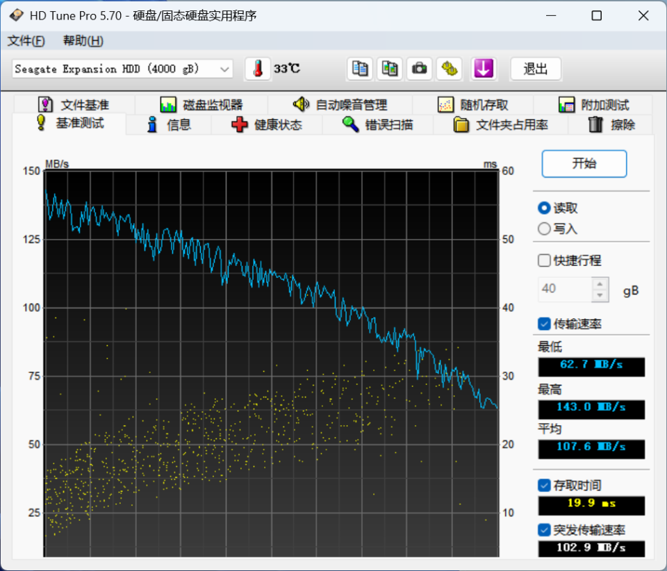 🔺接着使用HD Tune Pro看下它的基准表现,主要是测试硬盘的读写性能。通过上图可以看出它的平均速率也达到107MB/s,并且显示的图示是一条圆滑的曲线下降,没有明显的断崖式下降,说明硬盘的读写性能比较稳定。