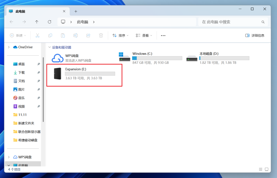 🔺这款硬盘是即插即用,无需驱动的,连接电脑之后可以看到电脑会自动识别硬盘,并且会准确显示盘符和图标,显示的可用容量为3.63TB,因为硬盘厂家和电脑系统两者的进制算法不一样,4T的硬盘这里显示3.63TB是完全正常的,不存在虚标的情况。