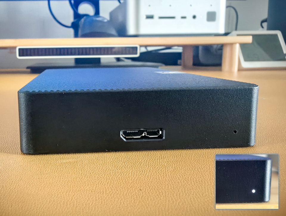 🔺接口在硬盘的顶部侧面,采用的是标准 Micro-B(3.0)接口,虽说之前的USB 3.0移动硬盘盒绝大多数都是使用的这个接口,不过现在都2024 年了,没有使用Type-C确实略有遗憾。