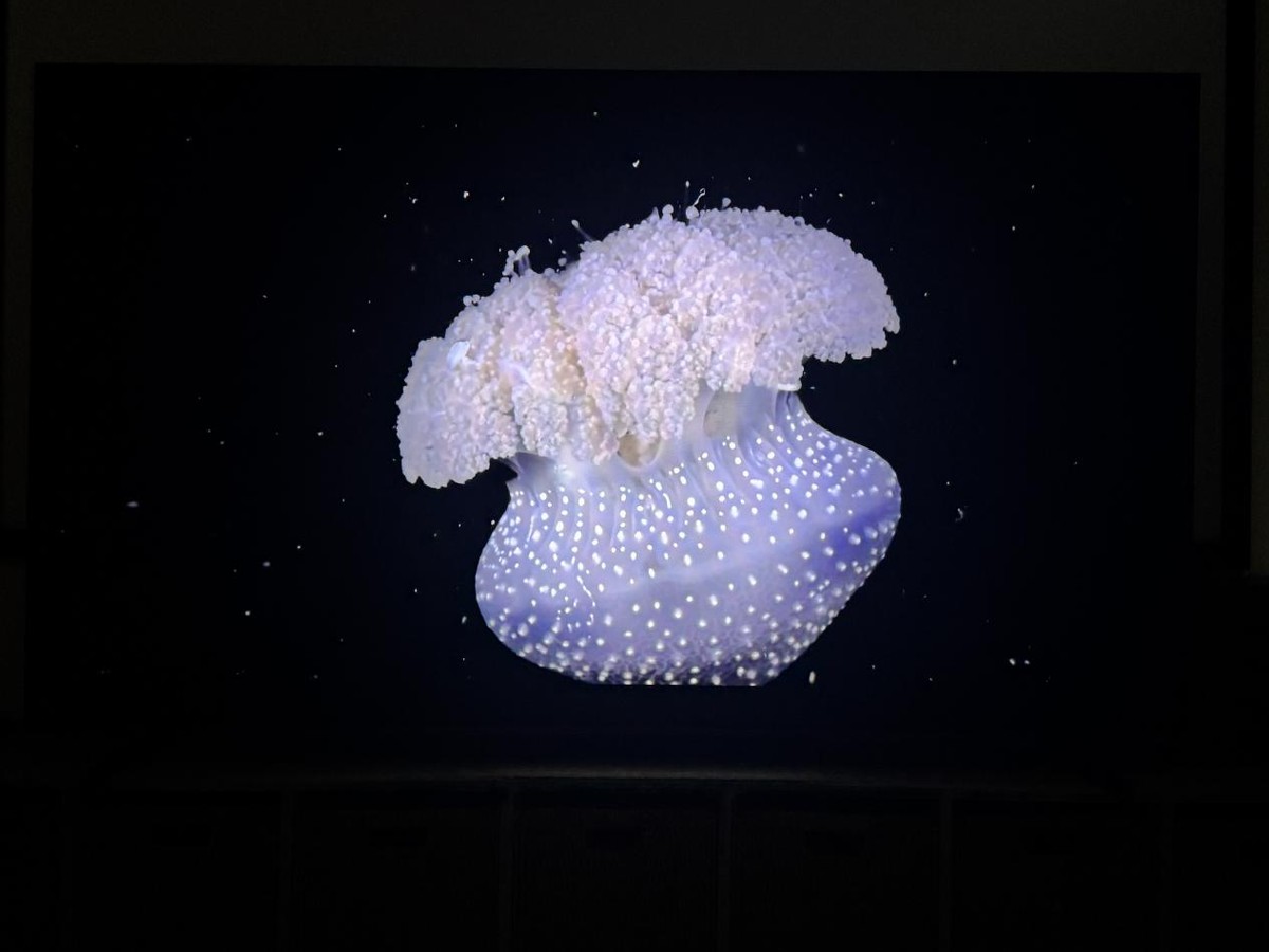 而黑曜屏 Pro带来的除了更低的反射率外,同时黑度也3倍领先于同类产品,可以看到借助黑耀屏Pro的加持,海底的水母十分立体,在关灯后屏幕和环境甚至可以融为一体让我们拥有更沉浸的观影体验。