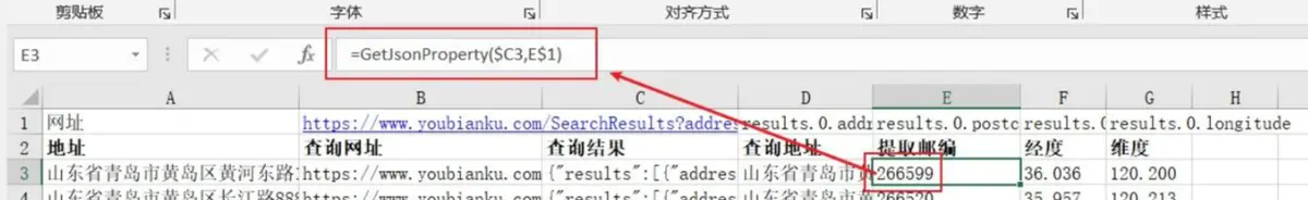步骤7,提取搜索结果。当Excel浏览器抓取完毕后,回到Excel表格,重新计算公式,此时会发现已经查到了结果,接下来写Json提取公式提取需要的数据。比如,提取邮编的公式写成=GetJsonProperty($C3,"results.0.postcode"),其中"results.0.postcode"就是json数据中的邮编数据。依次还可以提取经纬度。