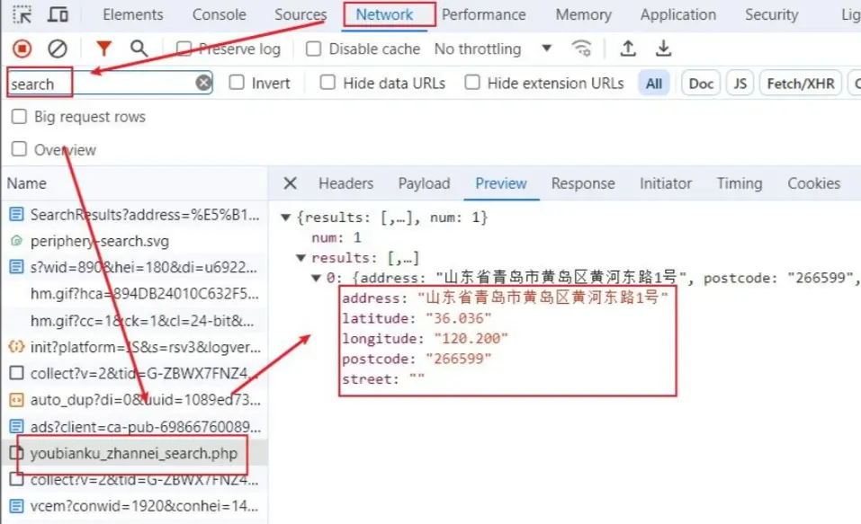 在开发者工具Network网络请求中,找到查询结果,因为是json格式,所以提取相对容易一些。