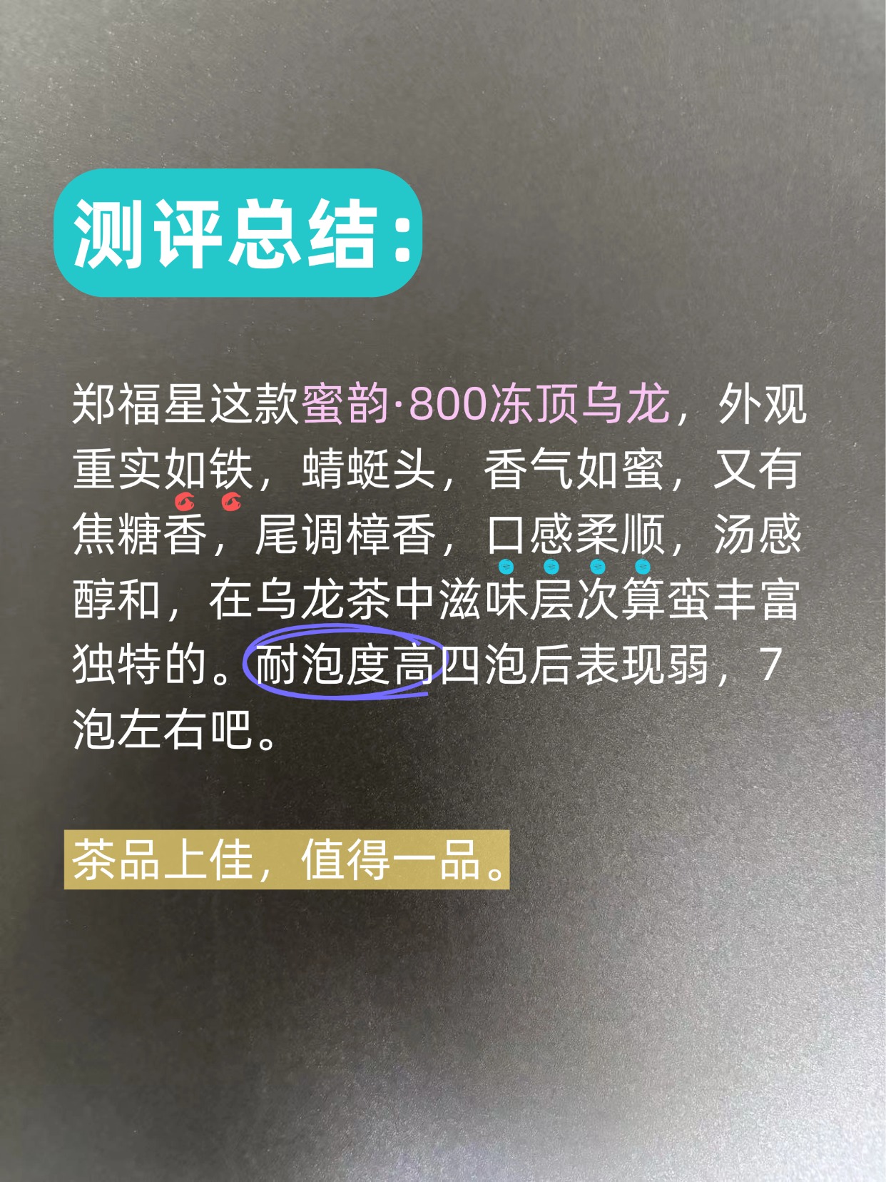 郑福星这款蜜韵·800冻顶乌龙,外观重实如铁,蜻蜓头,香气如蜜,又有焦糖香,尾调樟香,口感柔顺,汤感醇和,在乌龙茶中滋味层次算蛮丰富独特的。耐泡度高四泡后表现弱,7泡左右吧。茶品上佳,值得一品。