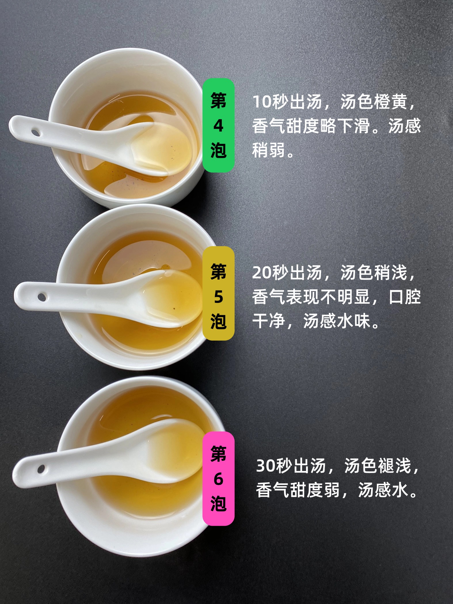 第六泡,30秒出汤,汤色褪浅,香气甜度弱,汤感水。