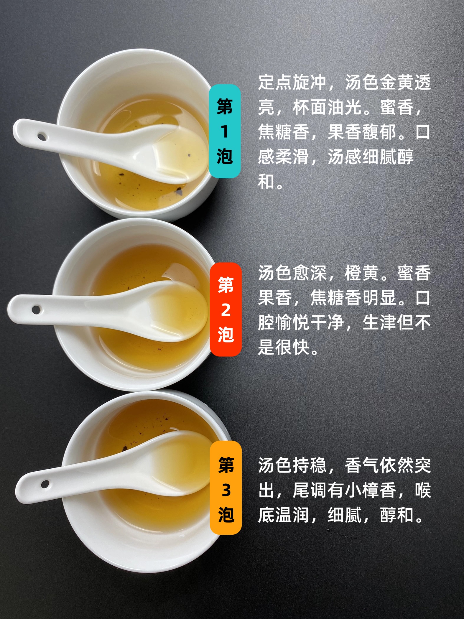 第一泡,定点旋冲,汤色金黄透亮,杯面油光。蜜香,焦糖香,果香馥郁。口感柔滑,汤感细腻醇和。