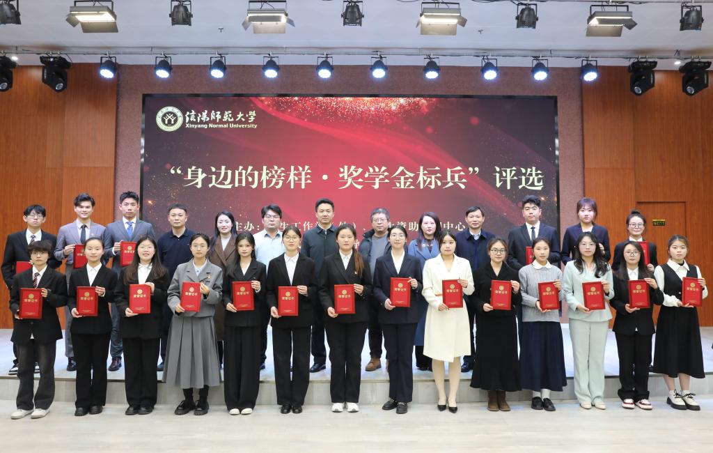 经个人申报、学院(书院)初赛推荐、学校复赛、线上展示等环节,全校共有20名候选人晋级决赛。各候选人通过个人展示生动展现了信阳师范大学学子笃志好学、勇于创新、甘于奉献、全面发展的精神风貌。经过激烈角逐,计算机与信息技术学院姜政宇等10名同学获2025年“身边的榜样·奖学金标兵”荣誉称号,教育科学学院王梦丹等10名同学获2025年“身边的榜样·奖学金标兵”入围奖。与会领导为其颁发获奖证书。