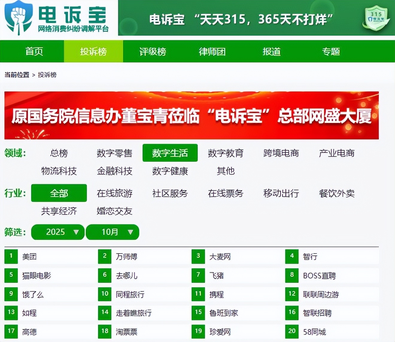 据网络消费纠纷调解平台“电诉宝”数据显示,2025年10月数字生活领域的投诉事件按投诉量排序依次为:美团、万师傅、大麦网、智行、猫眼电影、去哪儿、飞猪、Boss直聘、饿了么、同程旅行、携程、联联周边游、如程、走着瞧旅行、鲁班到家、智联招聘、高德、淘票票、珍爱网、58同城。
