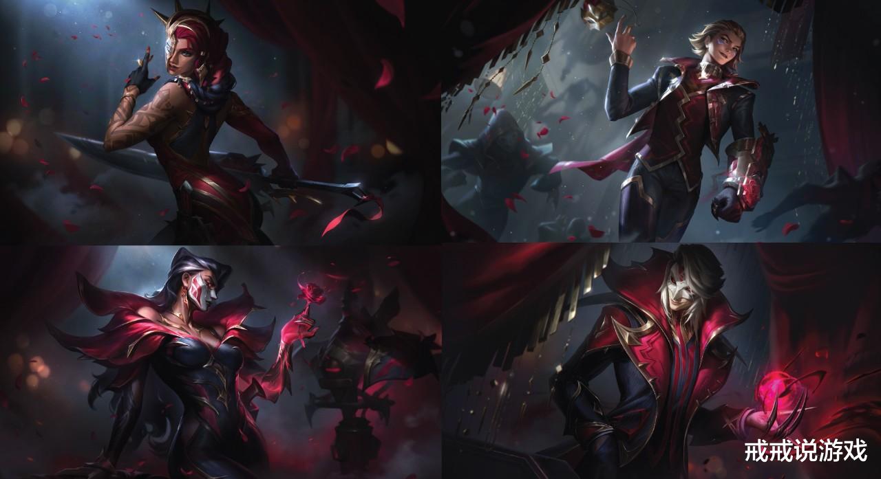 莎弥拉、烈娜塔、伊泽瑞尔、弗拉基米尔、伊莉丝以及至臻卡特琳娜携手带来了黑色玫瑰假面舞会系列皮肤,这也是通行证改版后的第一期皮肤。从原画上,玩家们就能一眼看出哪些是直售皮肤,哪些是通行证赠送皮肤。后续,拳头对原画进行了一些象征性的优化。其中,至臻卡特琳娜的模型堪称一绝,能够将十几年前基础建模留下的岁月痕迹掩饰到如此程度,让人不得不相信,这款皮肤的制作工作量远超前面那一群英雄(“一车面包人”形象化表达众多英雄)的皮肤。