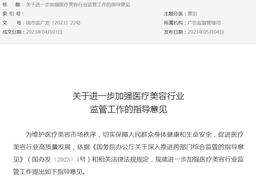 2023年,市场监管总局、公安部、商务部、国家卫生健康委、海关总署、税务总局、国家网信办、国家中医药局、国家药监局、最高人民法院、最高人民检察院等十一部门联合印发《关于进一步加强医疗美容行业监管工作的指导意见》。