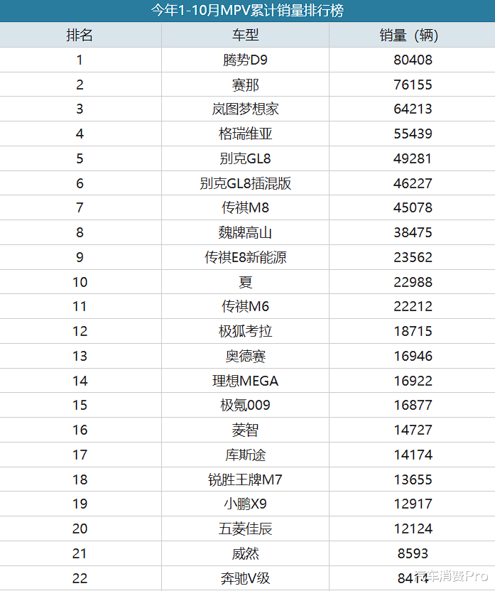 此前Pro哥给大家整理了10月份MPV的销量排名,本次就带大伙看一下今年1-10月份MPV累计销量排名情况。
