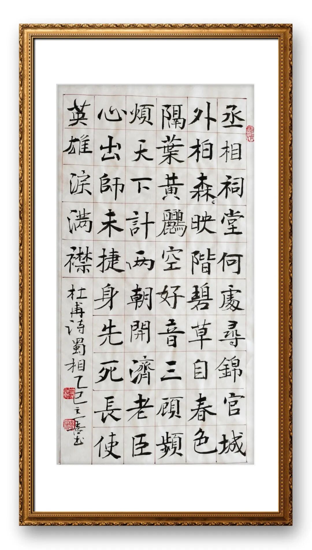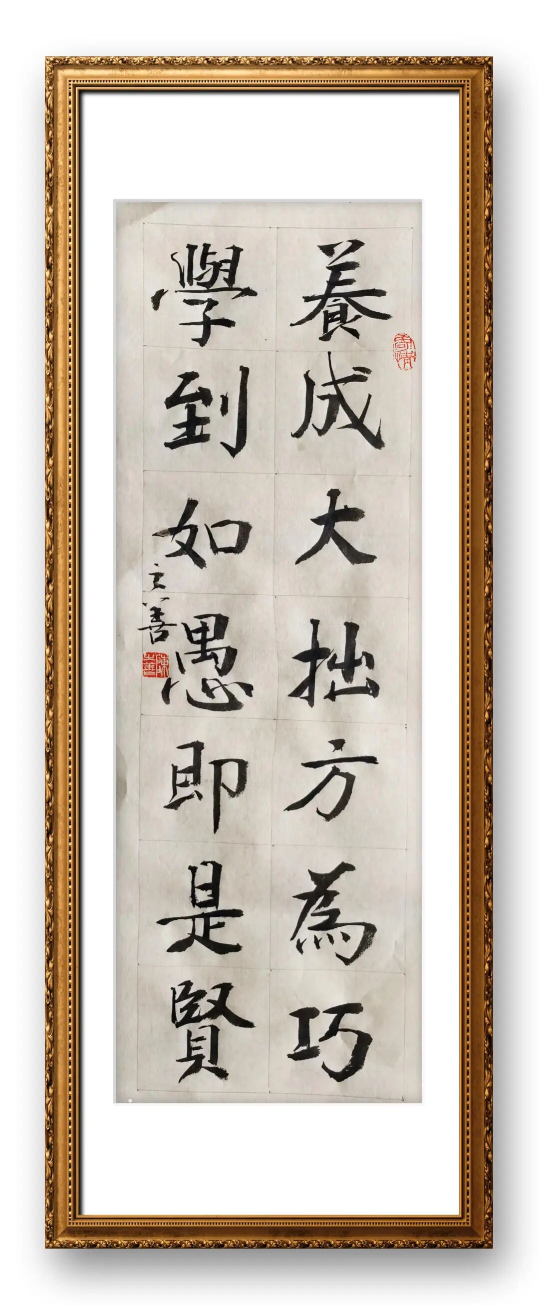 陈之善先生的书法创作,始终将“法度”视为艺术生命的基石,其风格的根基便建立在对经典碑帖的深耕细研之上,尤其在楷书领域的造诣,形成了“严谨不失灵动、端庄兼具朴拙”的鲜明特色。从整体风貌来看,他的楷书取法唐楷的端庄规整,兼收魏碑的雄健朴厚,避开了唐楷的刻板僵化与魏碑的粗疏生硬,形成了独树一帜的楷书风格。在笔法上,他恪守“中锋用笔”的核心原则,线条圆劲饱满、力透纸背,提按转折间尽显骨力与韧性,无一丝浮滑轻飘之感。具体而言,其点画精准利落,起笔多藏锋蓄力,行笔沉稳舒缓,收笔利落干净,如横画起笔藏锋后顺势铺毫,行笔中略加提按,收笔时回锋内敛,既保证了线条的厚重感,又避免了呆滞;竖画挺拔有力,如劲松扎根,不偏不倚,尽显沉稳气度;撇捺舒展有度,撇画轻起重收,捺画重起轻收,轻重缓急间拿捏精准,既有力度又有韵味。偏旁部首的搭配更是讲究,避让得体、主次分明,如左右结构的字,多注重偏旁间的呼应与平衡,左紧右舒或左舒右紧,错落有致却不杂乱;上下结构的字,则注重重心对齐,疏密得当,让整个字既稳重又不失灵动。