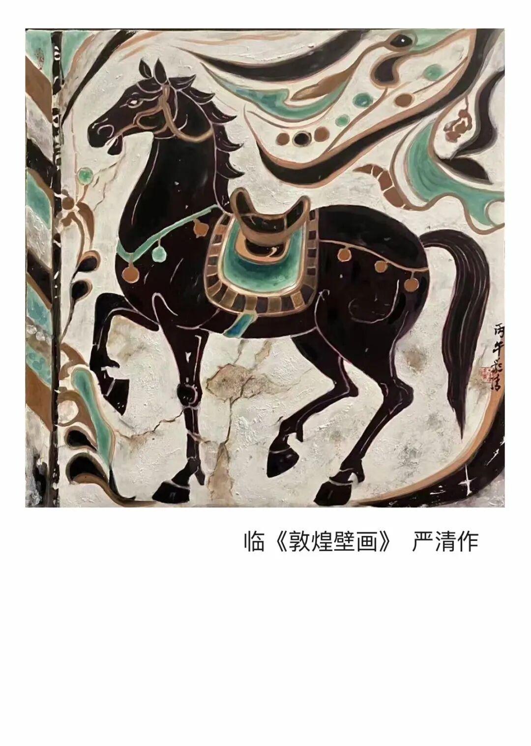 原作作为北朝隋唐时期鞍马壁画的代表,以动态与细节的极致刻画著称。严清的临摹作品在此方面表现尤为突出。动态捕捉精准传神:骏马的昂首姿态、鬃毛飘逸感及鞍鞯层次感,均与原作风格高度契合。线条流畅且富有张力,成功再现了壁画中骏马的矫健神韵,展现了艺术家对动态美学的深刻理解。细节还原一丝不苟:鞍鞯纹饰(如绿色鞍鞯上的几何图案)、马具金属质感等细节,均参照原作进行了细致复刻,体现了对传统鞍马艺术细节规范的精准把握,彰显了临摹者的专业素养,。