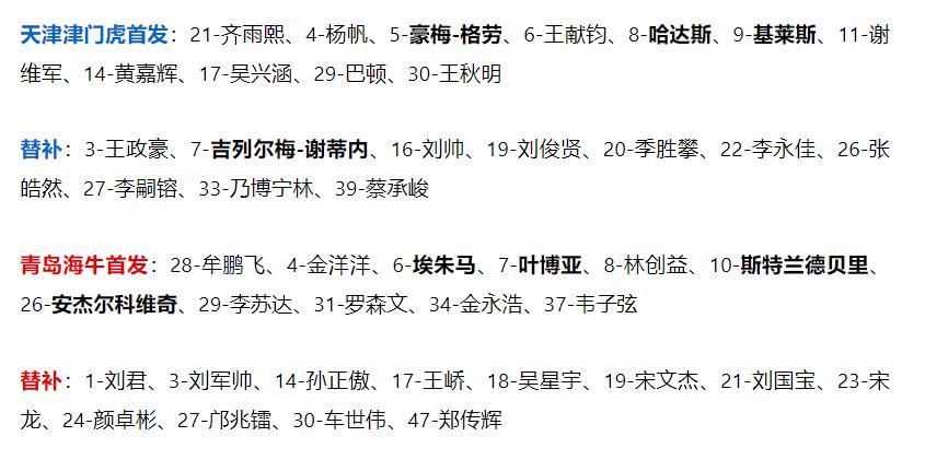 双方赛前首发:(天津津门虎三外援PK青岛海牛四外援,王秋明首发,金洋洋出战,值得注意的是,天津津门虎替补名单仅10人,孙铭谦、郭皓未进入大名单。)