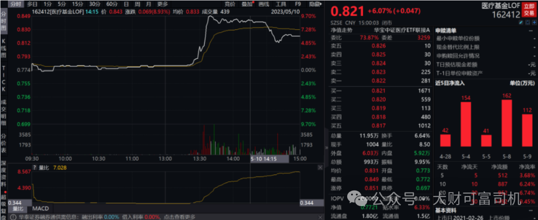 “ETF拯救世界”的号召力自不用说。2023年5月那桩“乌龙指”事件,至今还是基金圈的经典案例。当时,E大在官微发文,说要买入“华宝中证医疗ETF联接A(场内162412;场外162412)”,结果文章一发出,散户跟风盘直接把场内的医疗基金LOF(162412)推到逼近涨停。