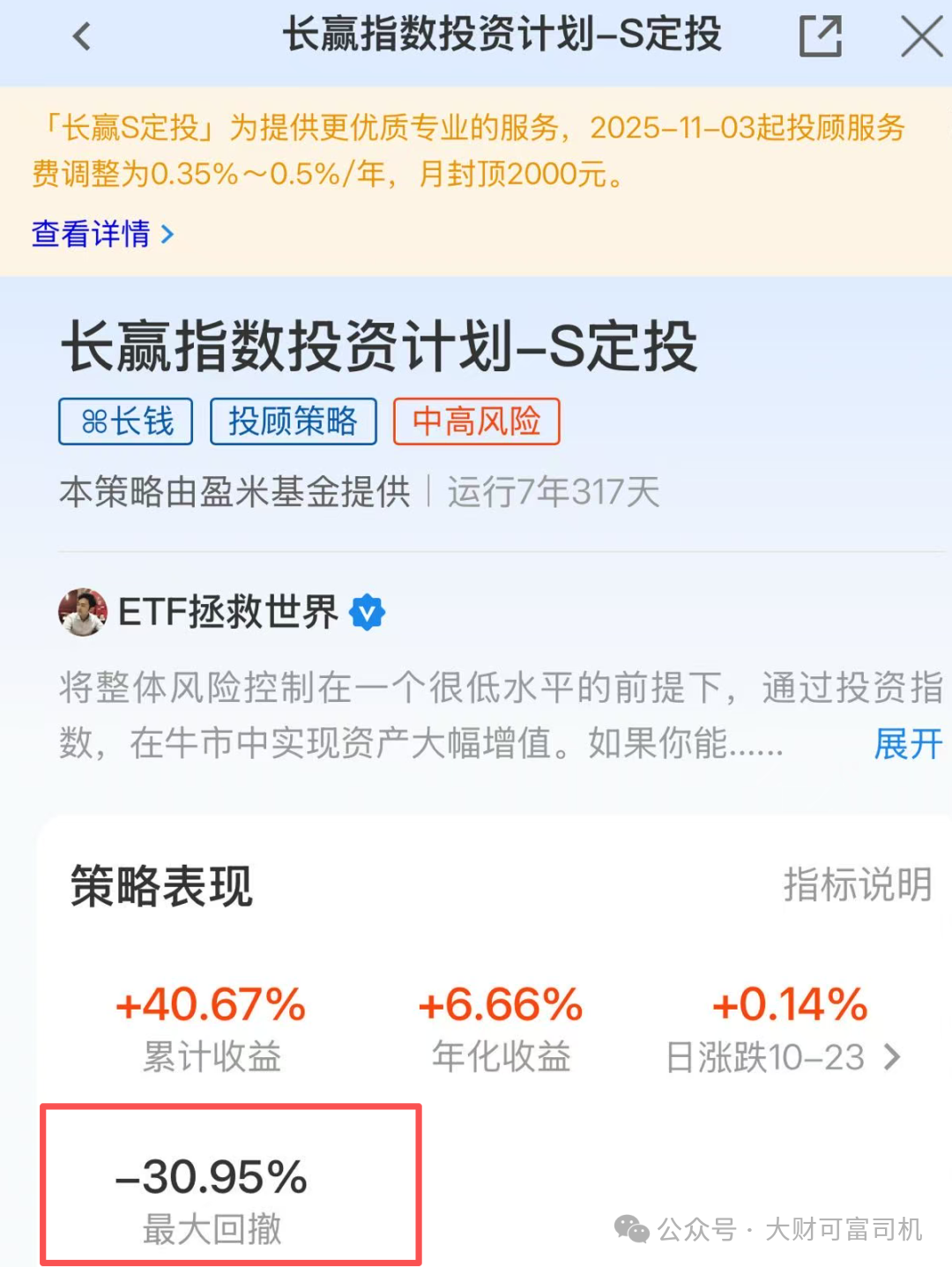 另一个长赢S定投虽然收益40.67%,年化收益6.66%,但最大回撤达到-30.95%。