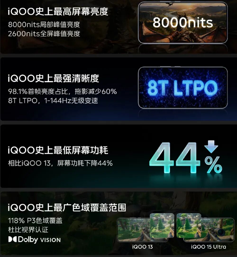 iQOO 史上最强清晰度,98.1% 首帧亮度占比,拖影减少 60%,8T LTPO,1-144Hz 无级变速;iQOO 史上最低屏幕功耗,相比 iQOO 13 下降 44%;iQOO 史上最广色域覆盖范围,118% P3 色域覆盖,杜比视界认证。