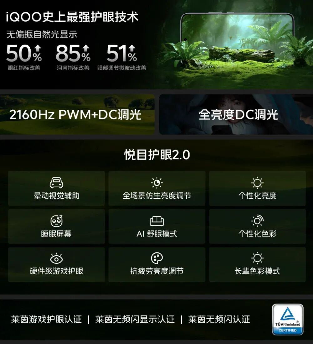 iQOO 史上最强护眼技术,无偏振自然光显示,眼红指标改善提升 50%,泪河指标改善提升 85%,眼部调节微波动改善提升 51%。iQOO15 Ultra屏幕还支持 2160Hz PWM+DC 调光、全亮度 DC 调光、悦目护眼 2.0,通过莱茵游戏护眼认证、莱茵无频闪显示认证、莱茵无频闪认证。
