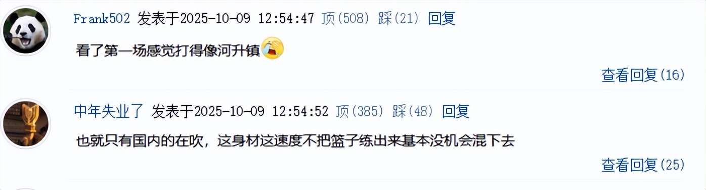 对于美国球迷的说法,不少国内球迷表示认同,并说看了第一场,感觉杨瀚森打得像河升镇。还有球迷说,杨瀚森这身材这速度不把篮子练出来,基本没机会混下去。
