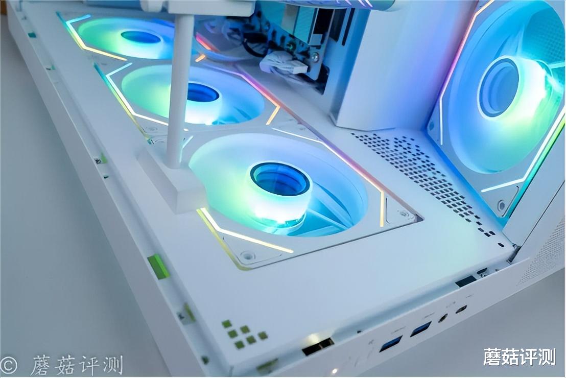 Tt这款钢影透EX Ultra海景房机箱是真的不错,作为一款海景房机箱,在侧面和前部有大面积的玻璃侧透,可以270°全方位的展示机箱内部各种硬件的灯效。另外在散热方面,机箱前背侧的机箱风扇位采用巧妙的倾斜设计,可以完美躲过显卡、不产生兼容性问题的同时,配合背面的一整块金属格栅盖板,可以给机箱内部提供充足的进风,且直吹显卡,提高整体的散热效率。