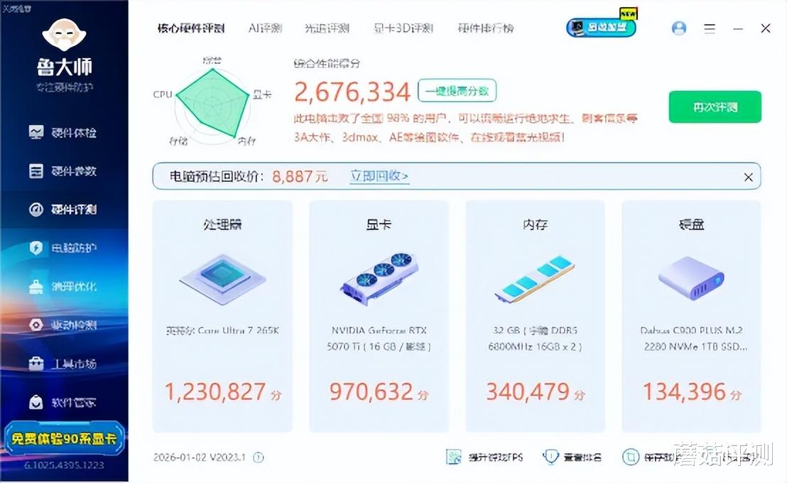 ▼简单跑个整机测试,整机得分267.6W,其中处理器单独得分123W,显卡单独得分97W,分数都很高。