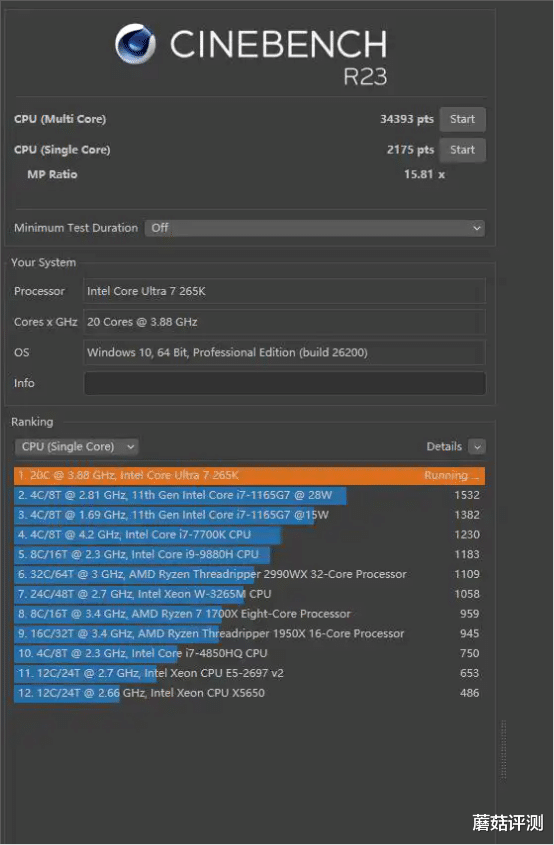 ▼跑个CineBench R23,单线程得分2175,多线程得分34393,多线程分数非常漂亮。