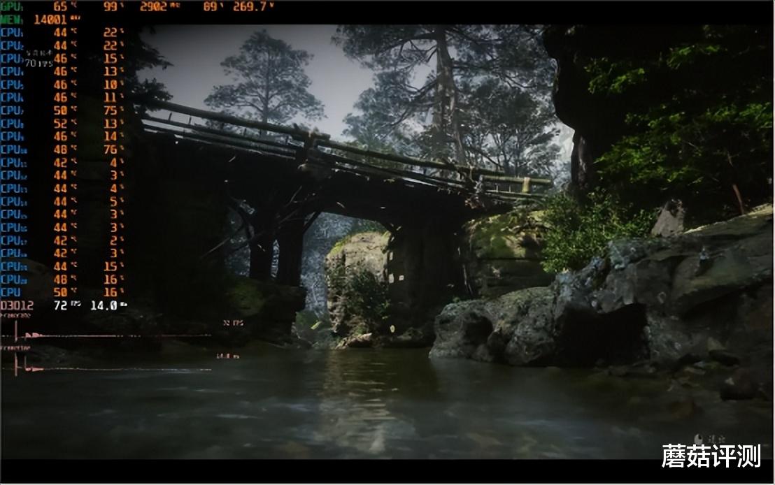 ▼水面的波光效果不错,小桥处的游戏帧数在70帧左右,显卡占用99%。