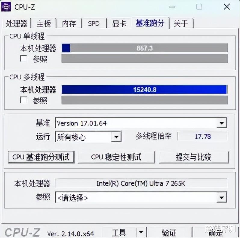 ▼简单跑个CPU-Z的测试,单核得分857.3、多核得分15240.8。