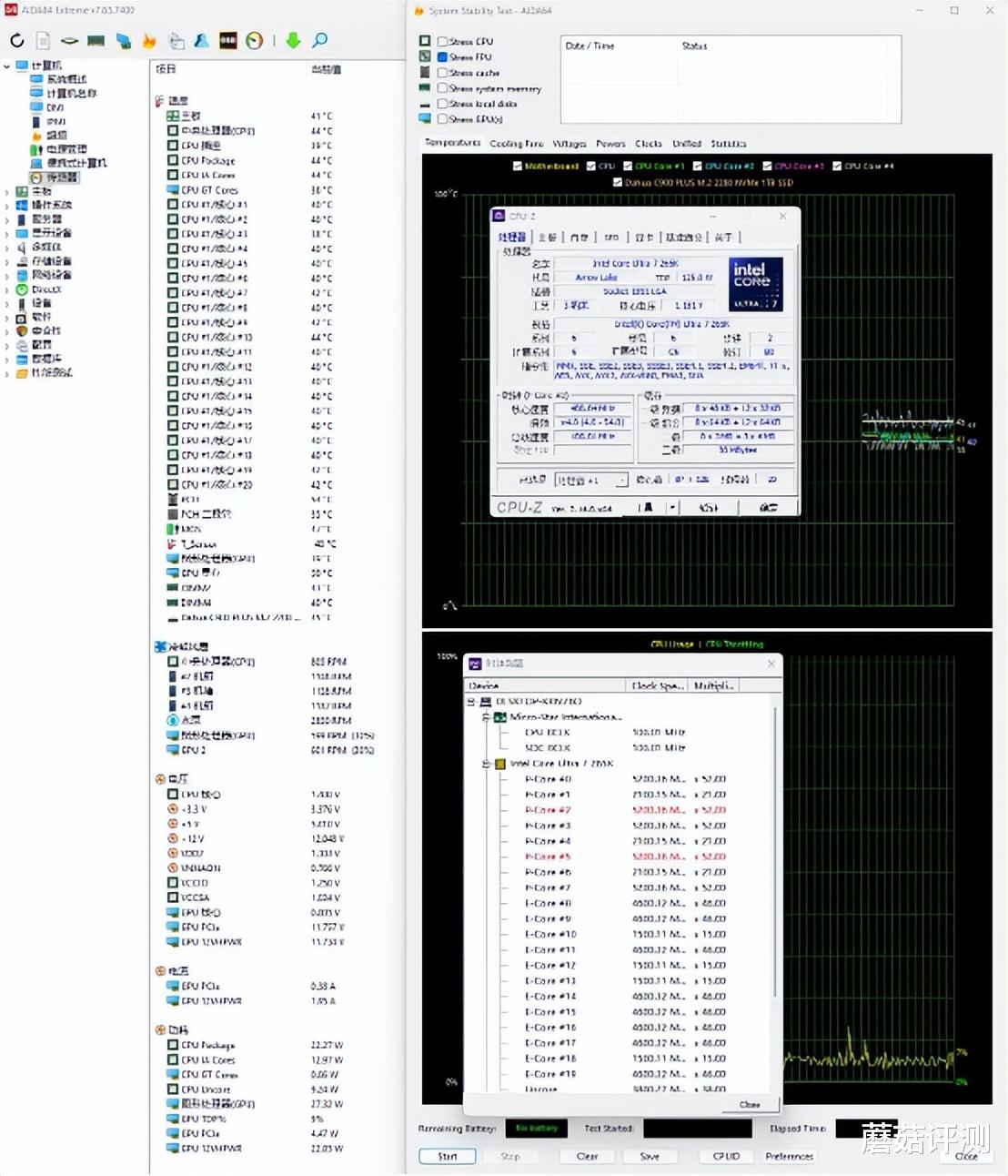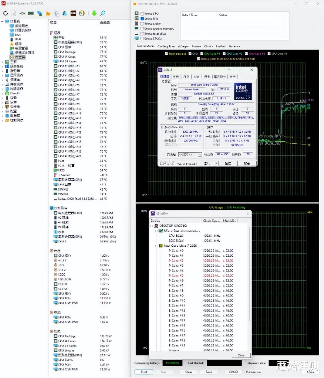 ▼跑个CPU-Z的压力测试,处理器功耗185W,P核睿频5.2GHz、E核睿频4.6GHz,温度78℃,南桥53℃,供电54℃,显卡核心37℃,固态43℃,处理器负载稍微提高,机箱内部的其他硬件温度均有明显下降,机箱的内部风道表现非常不错。