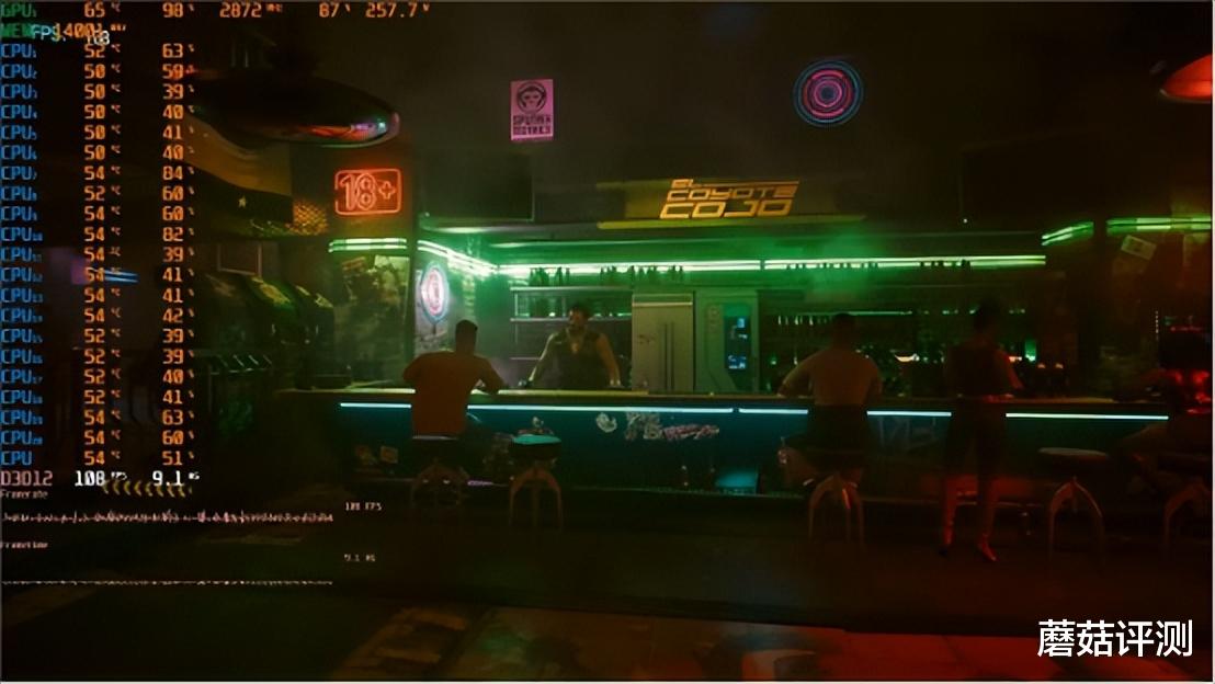 ▼酒吧吧台的光追效果很棒,游戏帧数在108帧左右,显卡占用98%。
