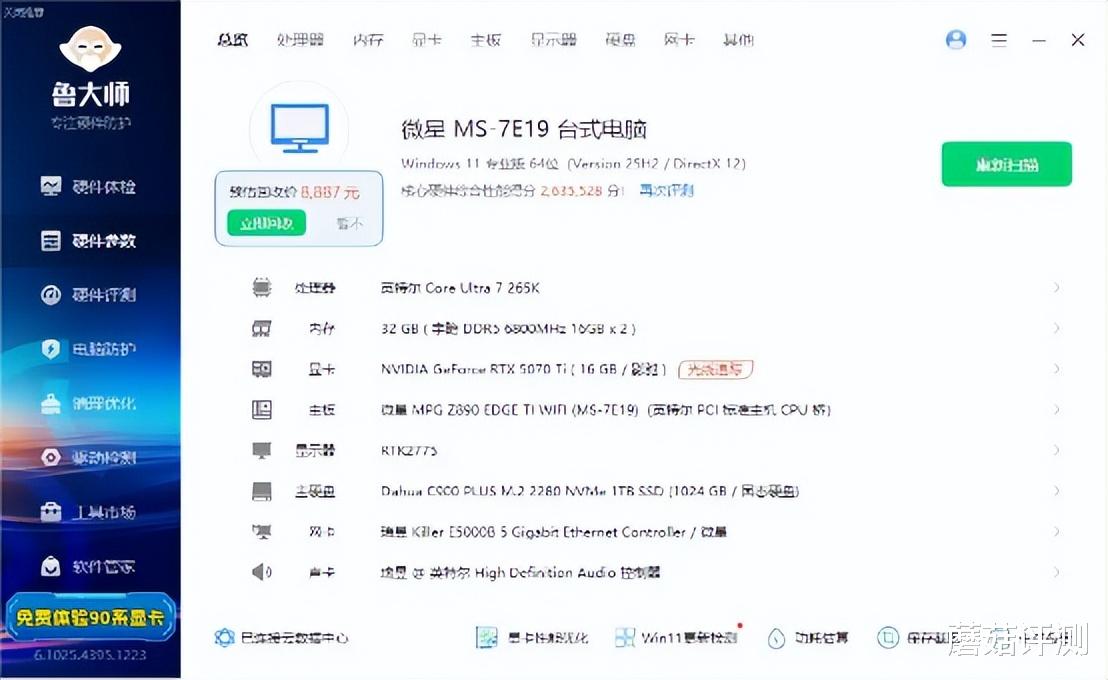 ▼整机配置一览,处理器是265K,主板是微星的Z890刀锋钛,显卡是影驰的RTX 5070 Ti星曜LUNA OC。