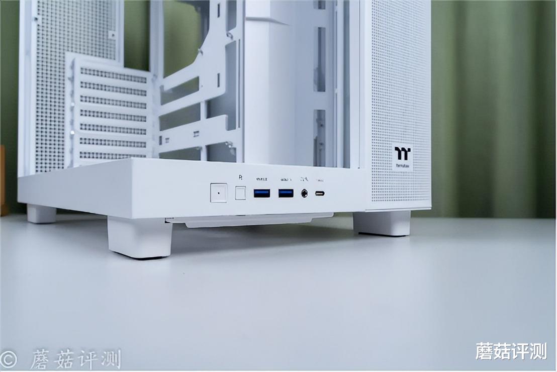▼机箱的IO面板在机箱前部的底部,除了开机键和重启键之外,还有两个USB 3.0接口、一个Type-C接口和一个3.5mm音频接口。