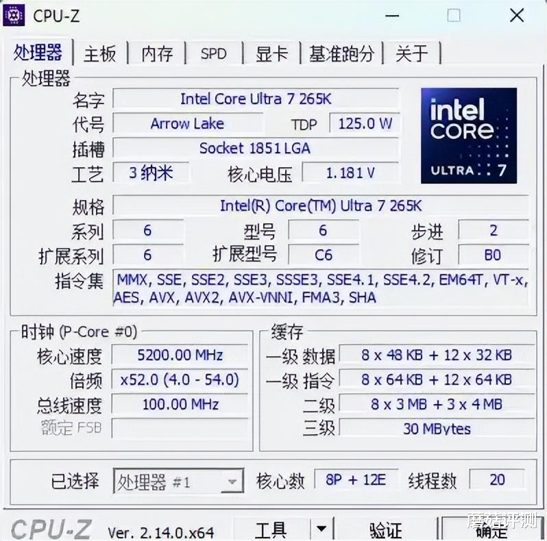 ▼简单看下这颗265K的硬件参数,8个P核、12个E核、三级缓存30MB,表现不错。