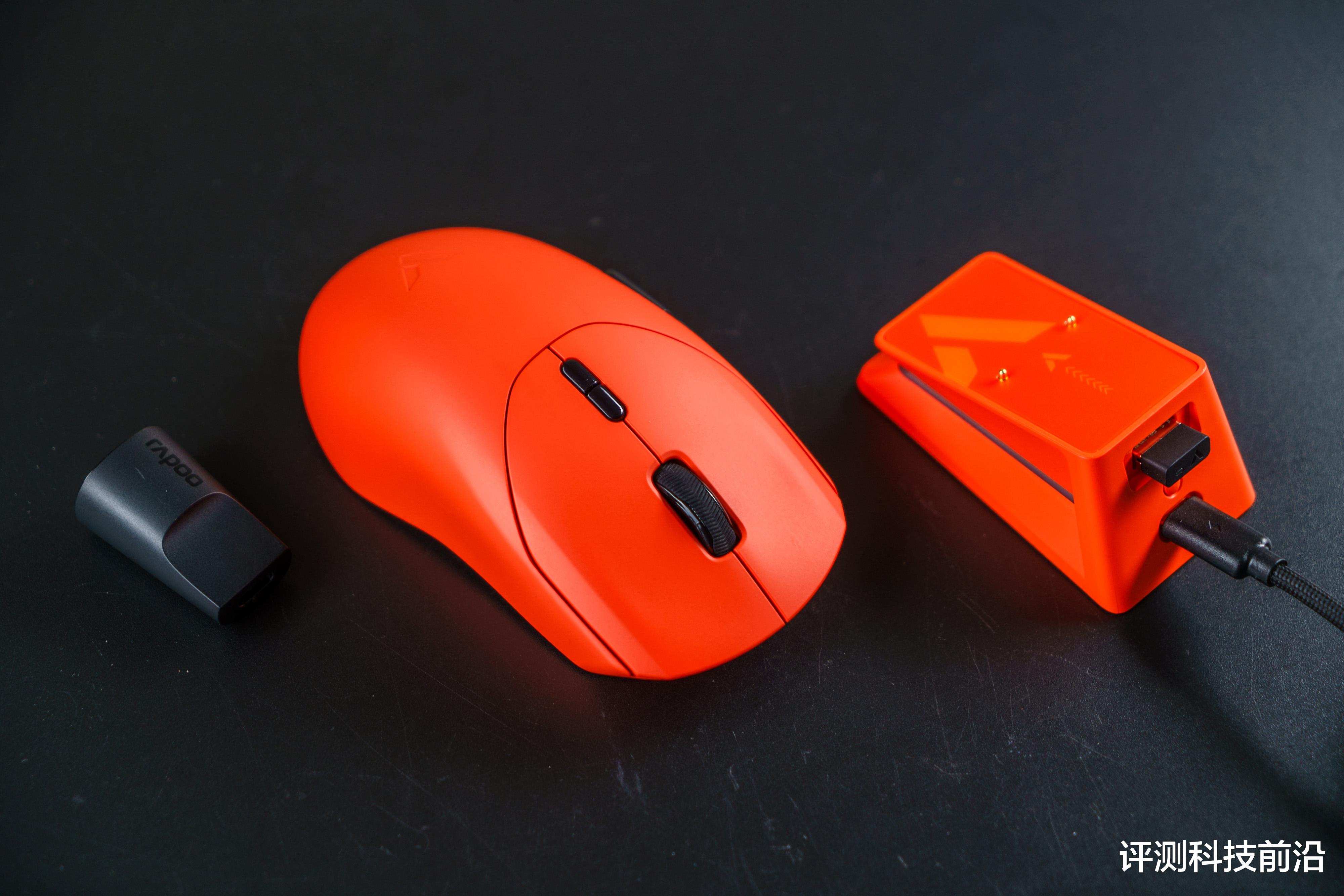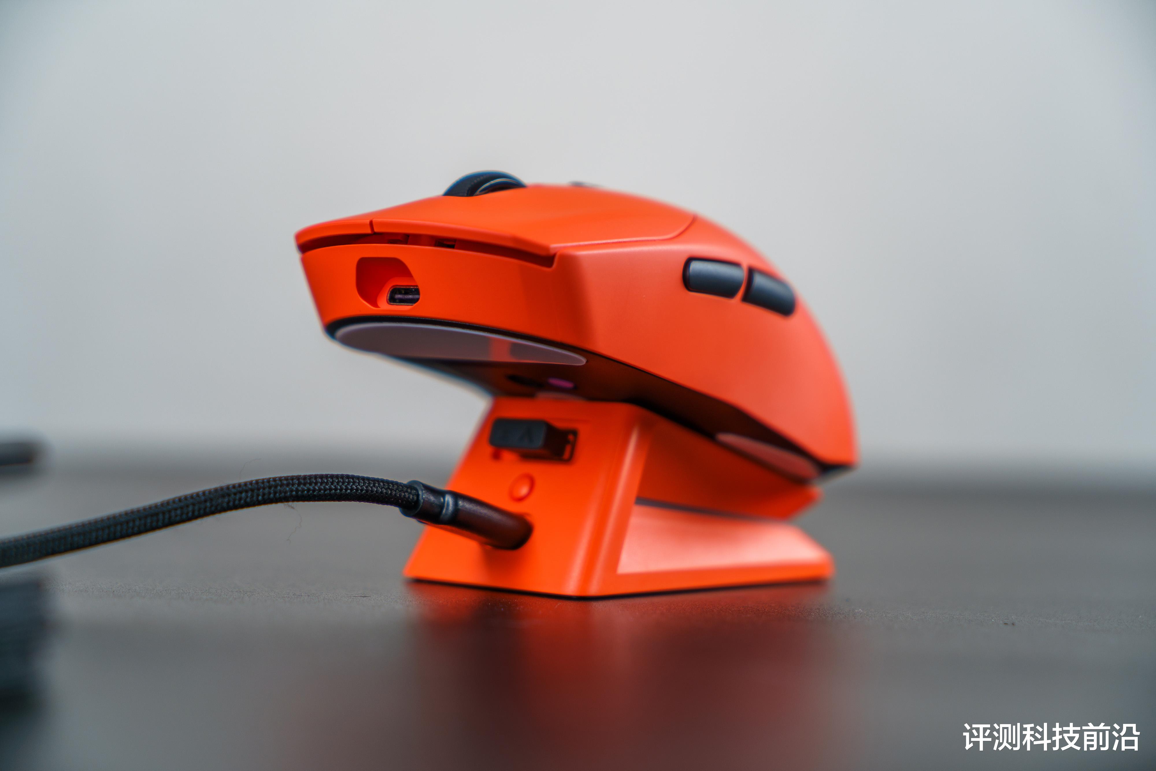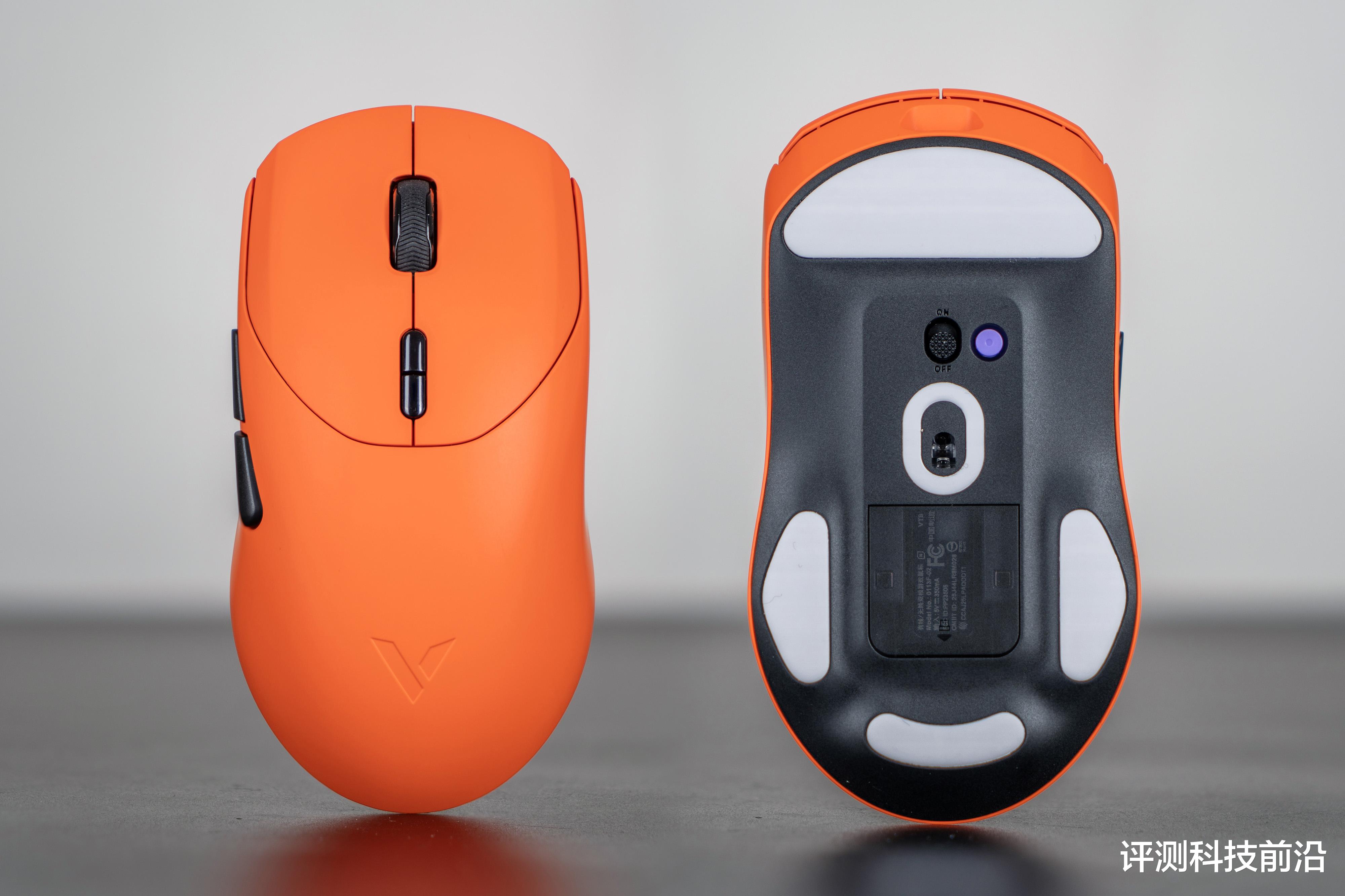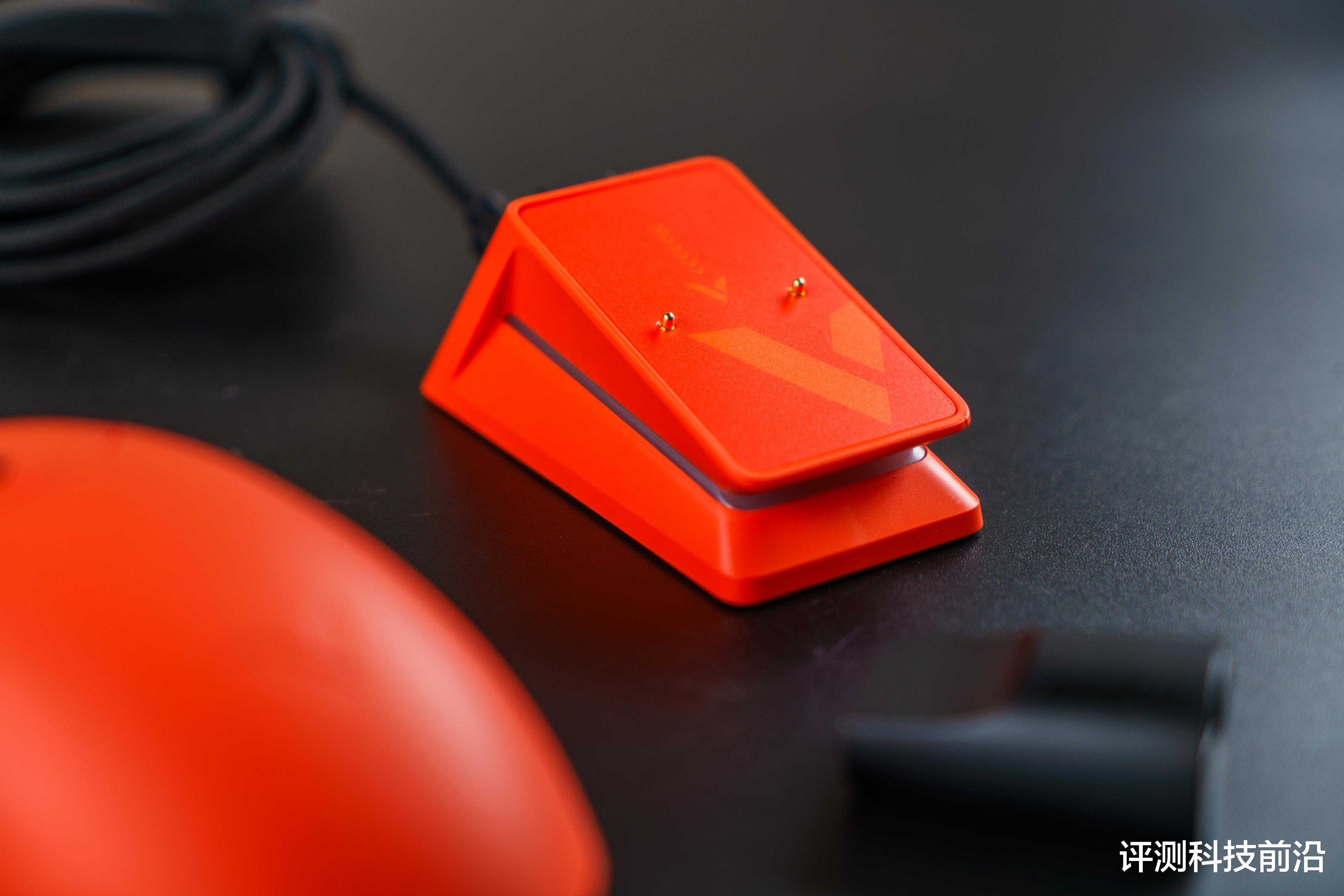 ▼主体部分都是焰影橙颜色,脚垫则是白色,不过我个人建议脚垫用深色的比较好,因为平放桌面之后是可以清晰看到脚垫侧面白颜色,导致脚垫存在感比较强,比较抢眼,如果采用深色(比如黑色)就不会那么显眼了;VT二代改进后的接收器收纳仓确实不错,继续保持