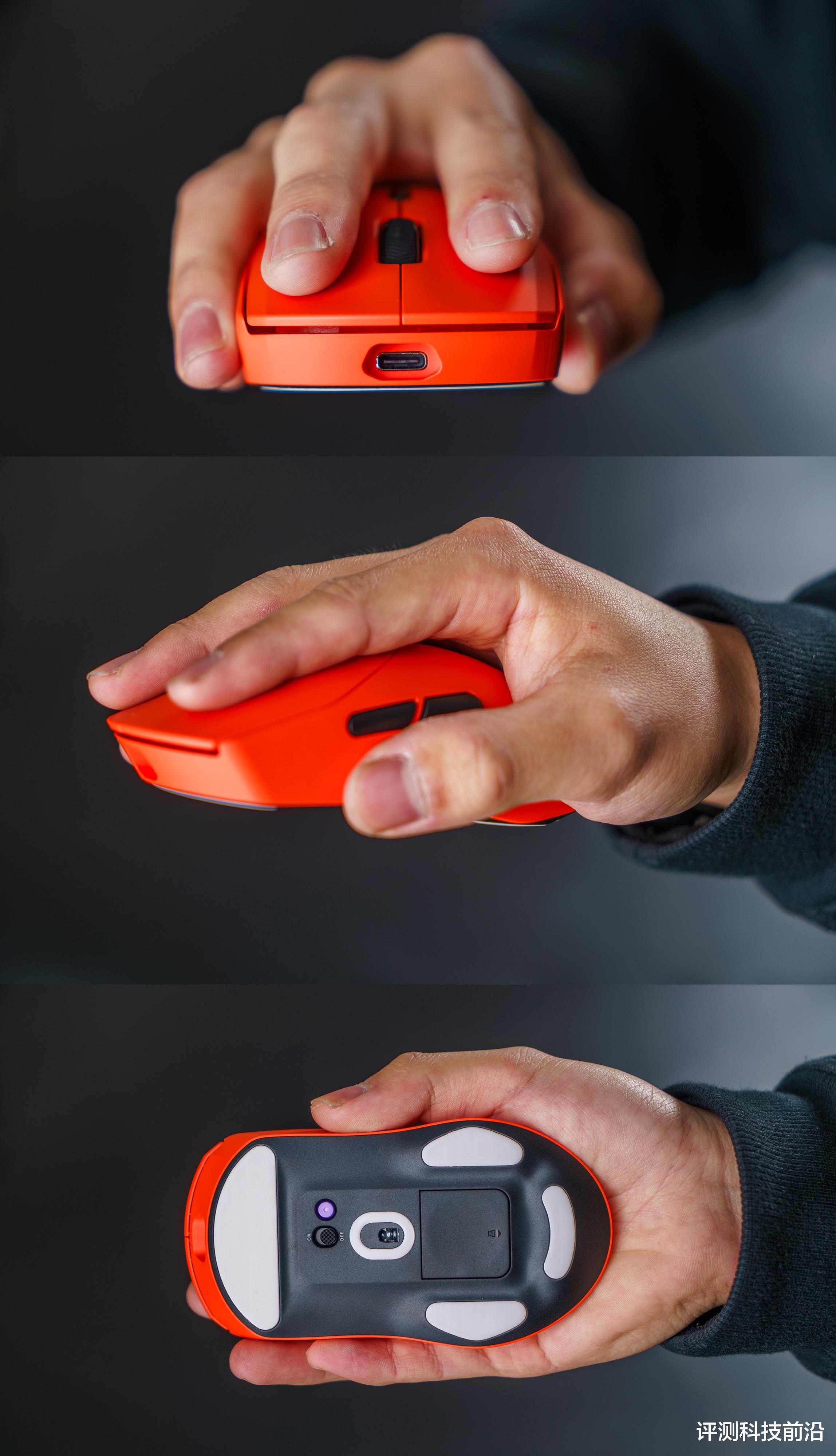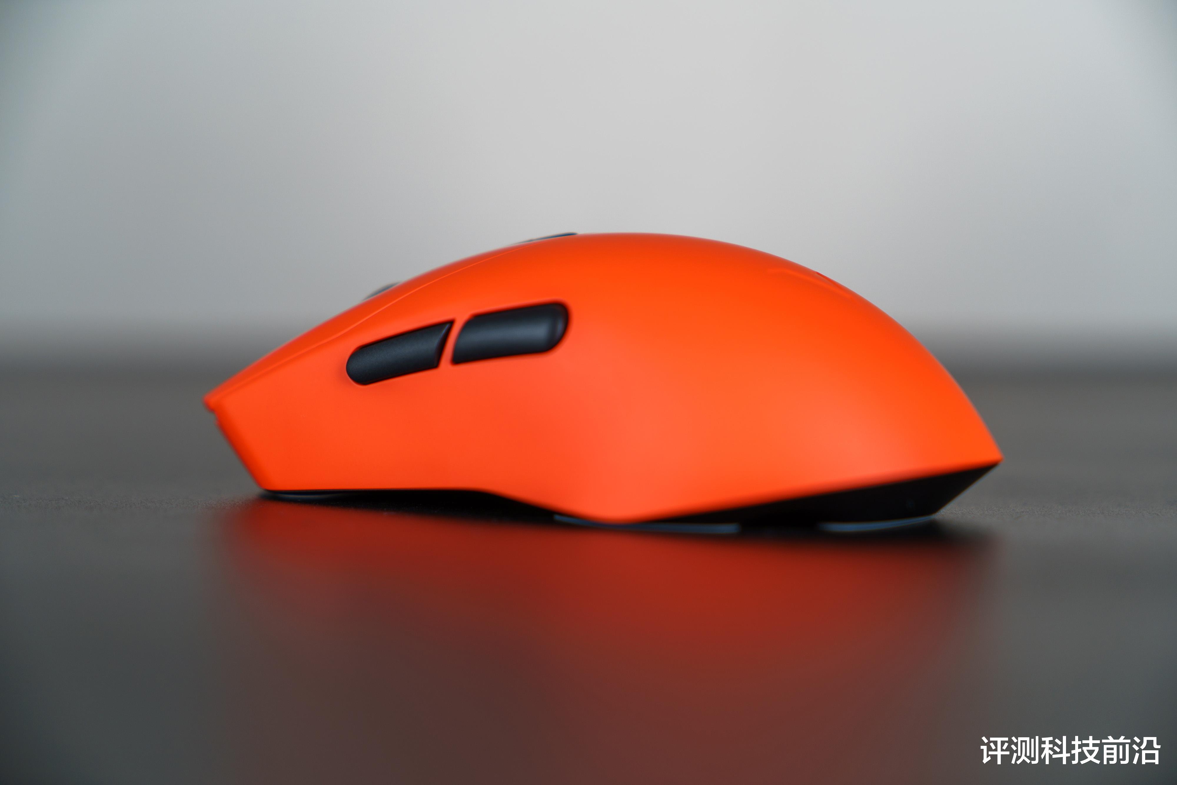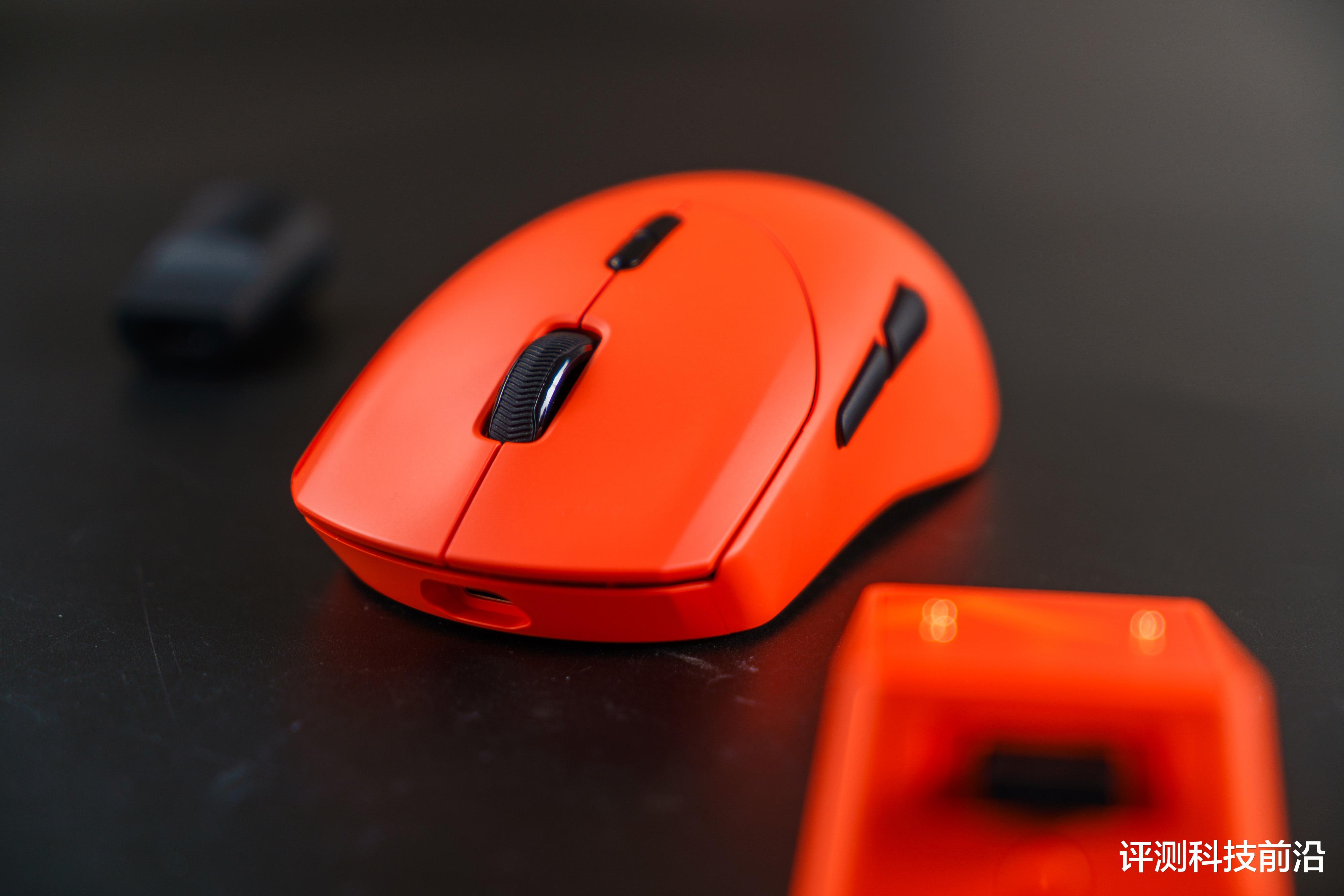 ▼主体部分都是焰影橙颜色,脚垫则是白色,不过我个人建议脚垫用深色的比较好,因为平放桌面之后是可以清晰看到脚垫侧面白颜色,导致脚垫存在感比较强,比较抢眼,如果采用深色(比如黑色)就不会那么显眼了;VT二代改进后的接收器收纳仓确实不错,继续保持