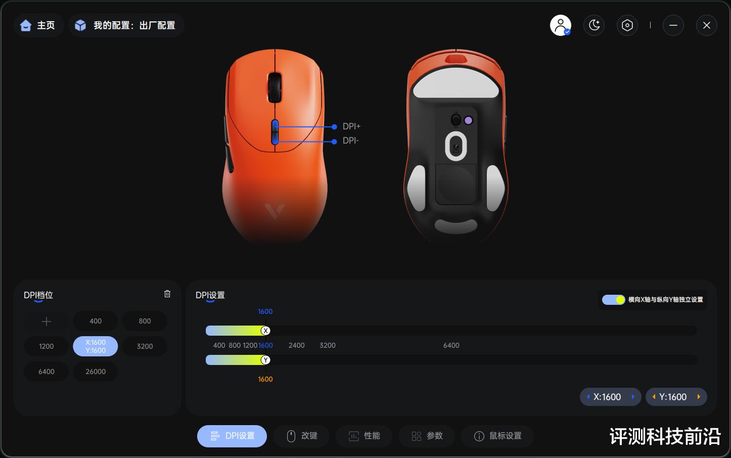 ▼DPI调节滑条上有7档预设数值,点击对应的数值就可以一键设置为该参数,很方便,标准版可调DPI范围为50-26000,最低以50为单位调节,比较容易调出适合自己的DPI,VT二代全系都支持开启独立的X/Y轴DPI数值,对于设置里没有单独垂直灵敏度调节的FPS游戏来说,这个功能那是相当有帮助