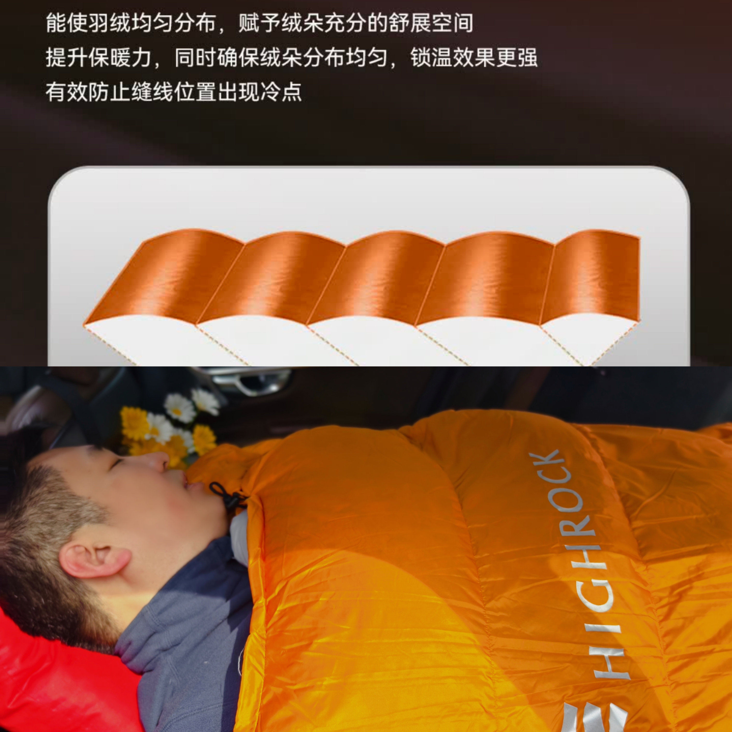 睡袋采用了平行交错的立衬结构,这种设计杜绝了羽绒串到一个角落的弊端,让羽绒可以均匀分布,使每一朵绒都可以充分绽放。达到强效锁温。并且睡袋内里也采用了高科技的远红外升温内里,在一定条件下释放出接近人体6-14um的远红光波。从内而外产生热量。
