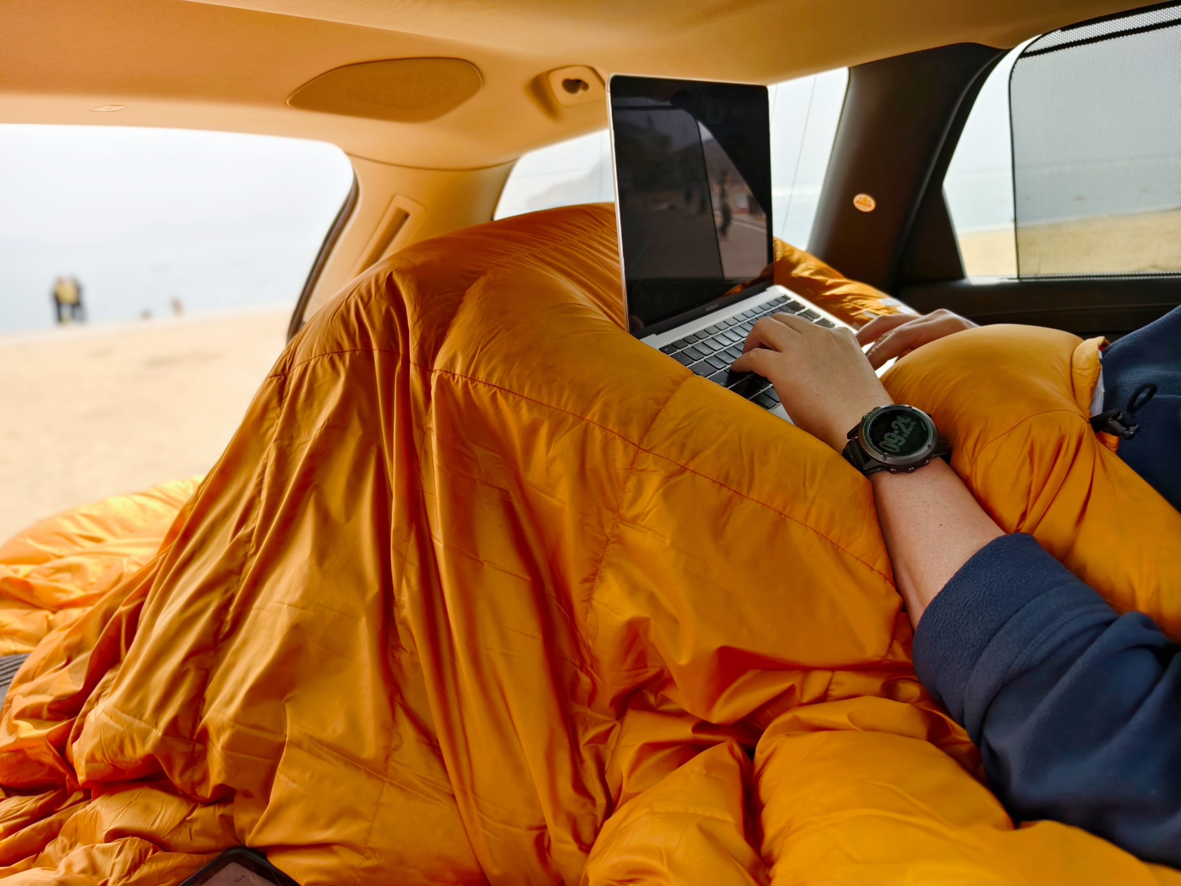 窝在车上推门就是海。心情惬意的很。同样是工作在这里就变成了度假风。