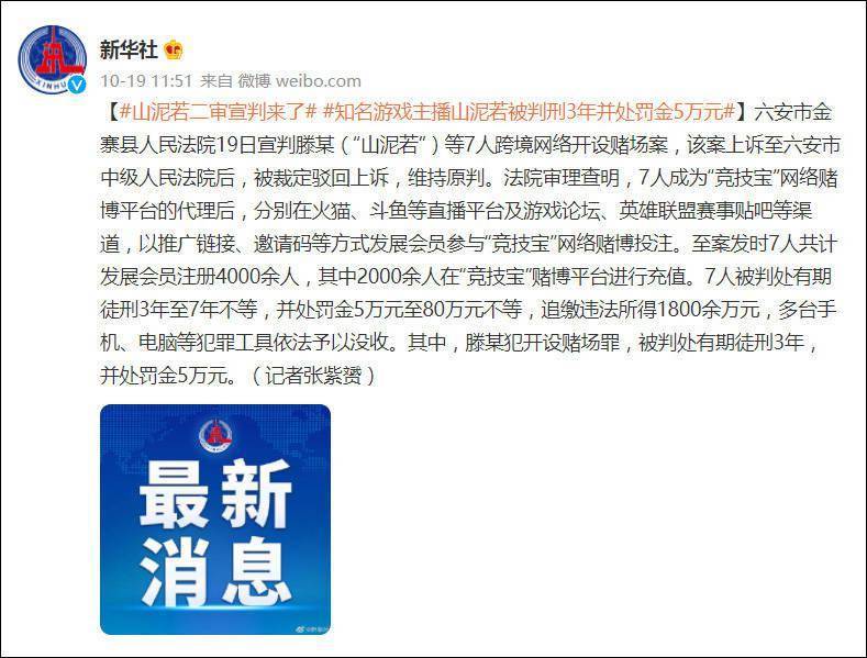 六安检察院在官微中称,河南某网络科技有限公司的王某某及南京某电子竞技俱乐部的祁某某、蒋某某等4人自2019年下半年至2020年年底,与“雷竞技”网络赌博平台管理人员相互合作,分别组织其雇请的游戏战队队员以不同的游戏战队名义参加DOTA2游戏竞技比赛,“雷竞技”将比赛赛程放在其赌博盘口上,供参赌人员对比赛结果竞猜下注,组织网络赌博活动。王某某和蒋某某根据“雷竞技”反馈的投注信息,指挥各自战队队员进行比赛,并同时在该赌博盘口下注,从中非法获利共计1000余万元。