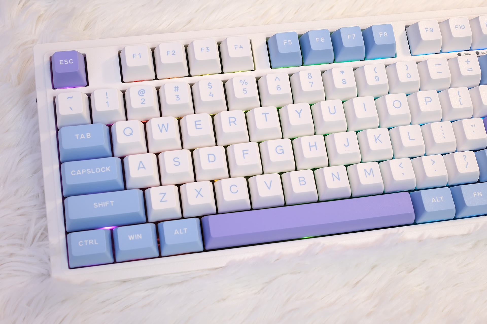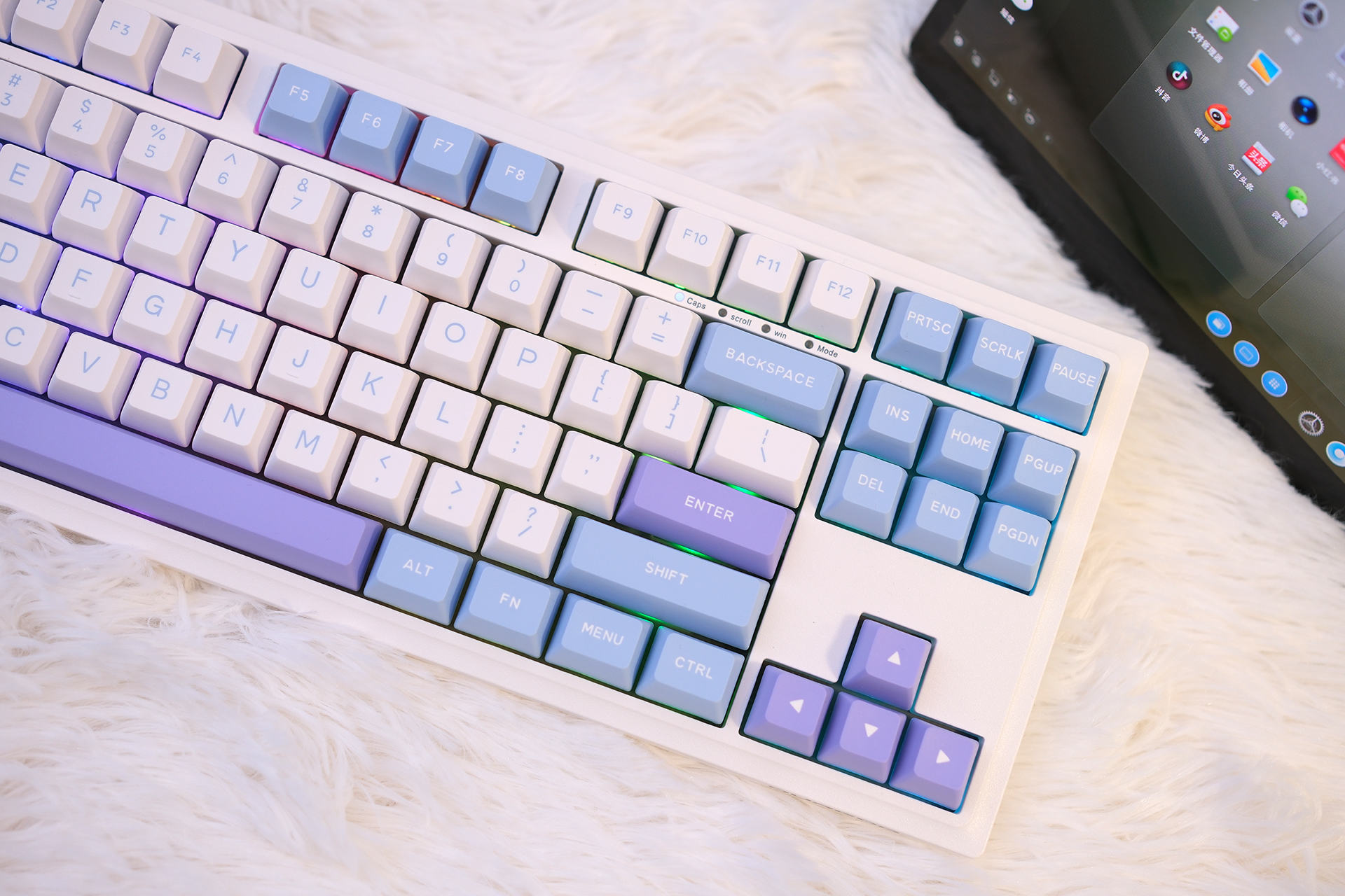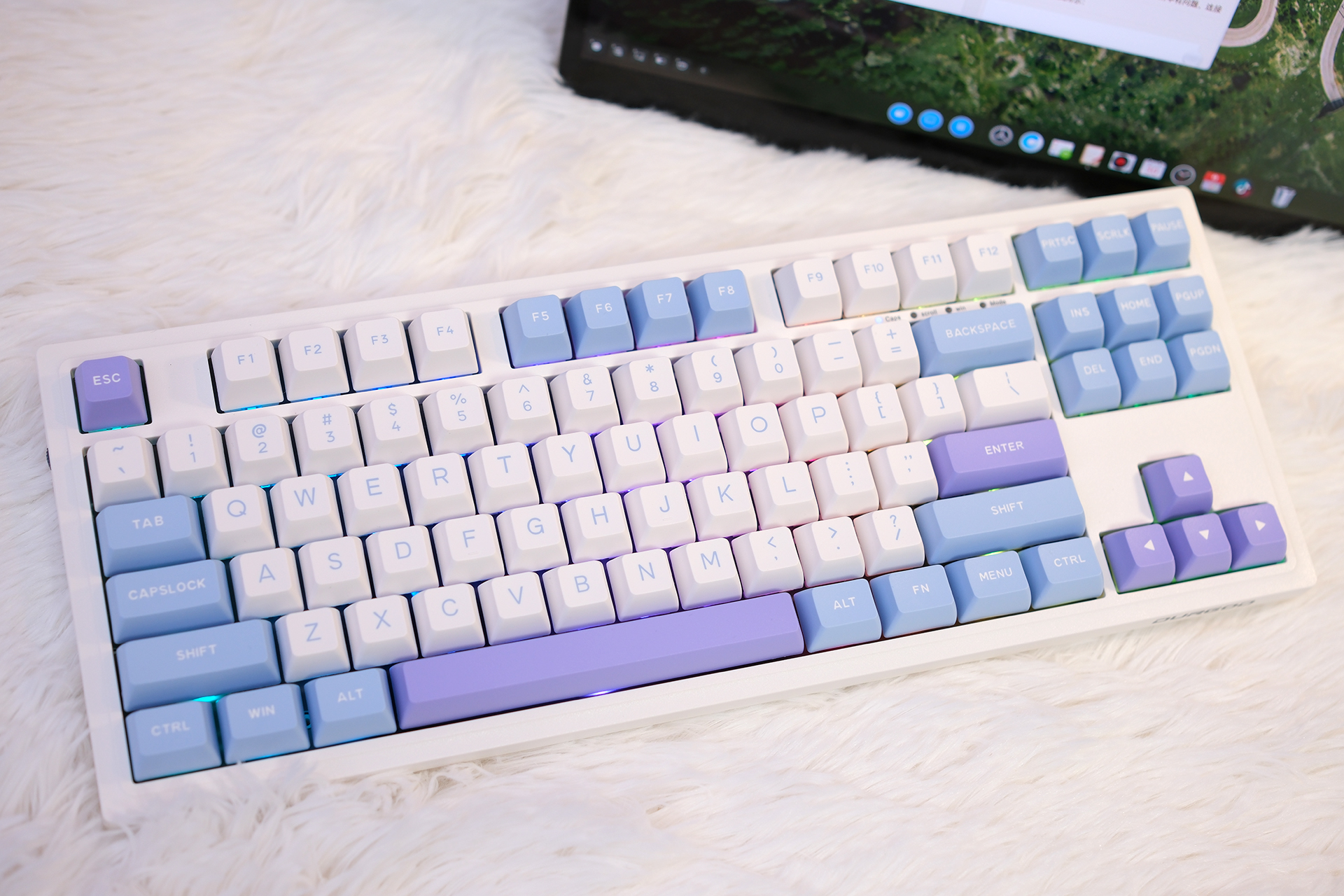 我可太喜欢杜伽K100的配色了,你看,无论从哪个角度看上去,都是紫、蓝、白三色辉映,官方叫冰莓色,然后如果是磁白轴的话官方还有一款皓月的配色也不错,大家有兴趣可以到电商平台看看。