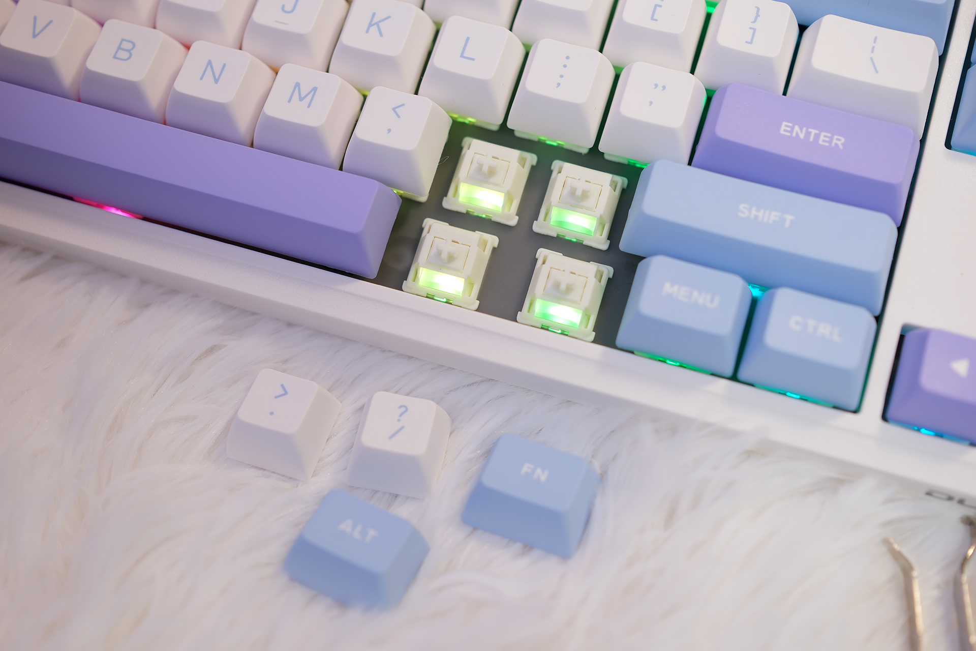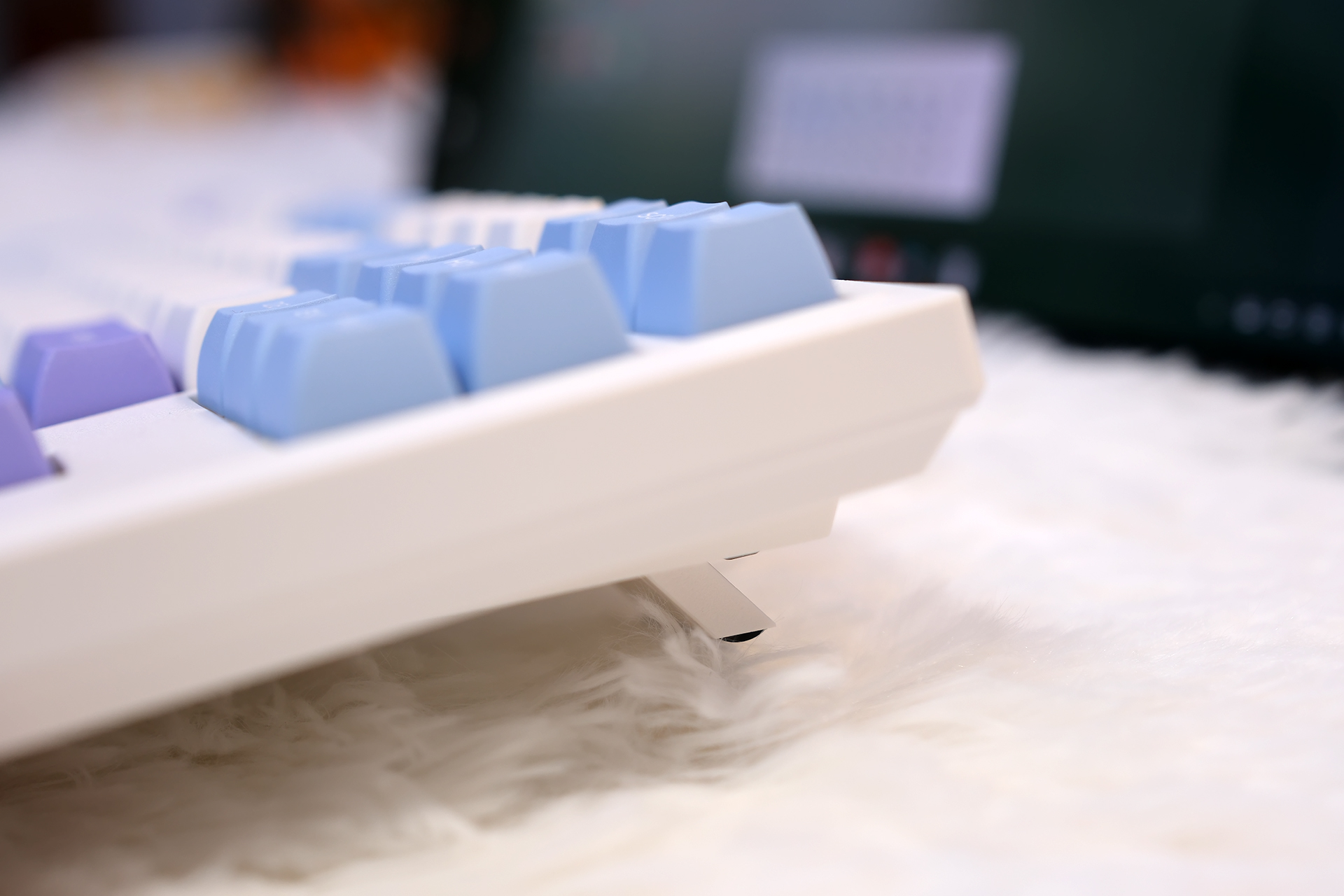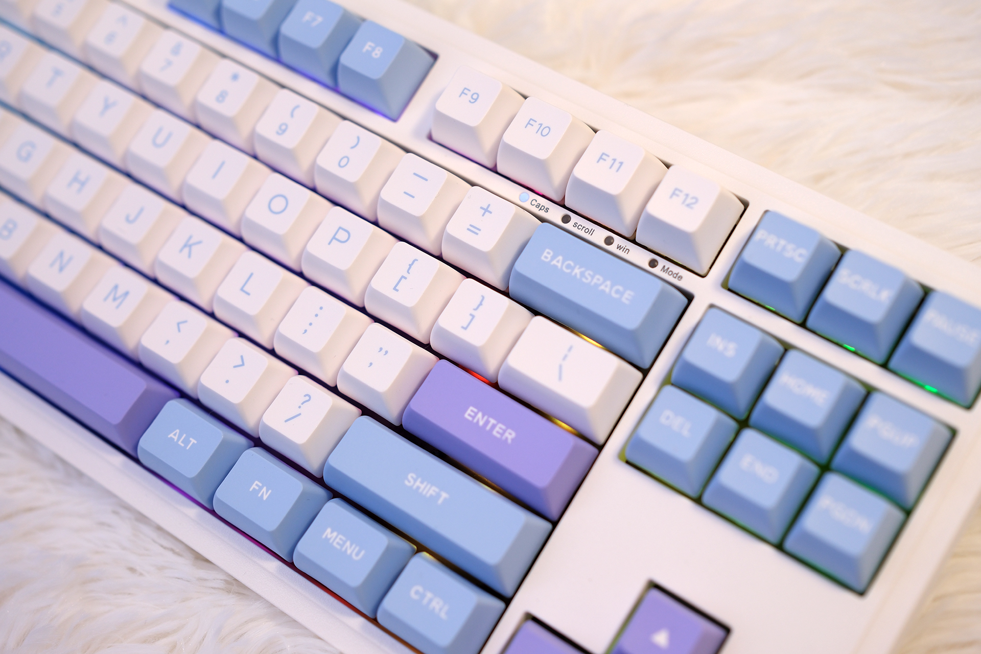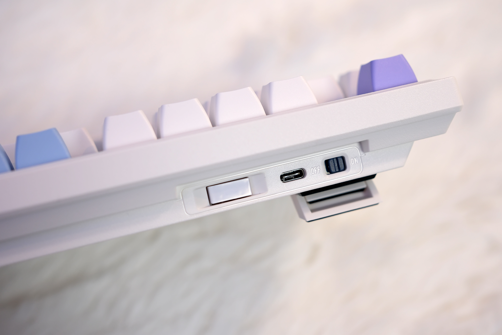 我可太喜欢杜伽K100的配色了,你看,无论从哪个角度看上去,都是紫、蓝、白三色辉映,官方叫冰莓色,然后如果是磁白轴的话官方还有一款皓月的配色也不错,大家有兴趣可以到电商平台看看。