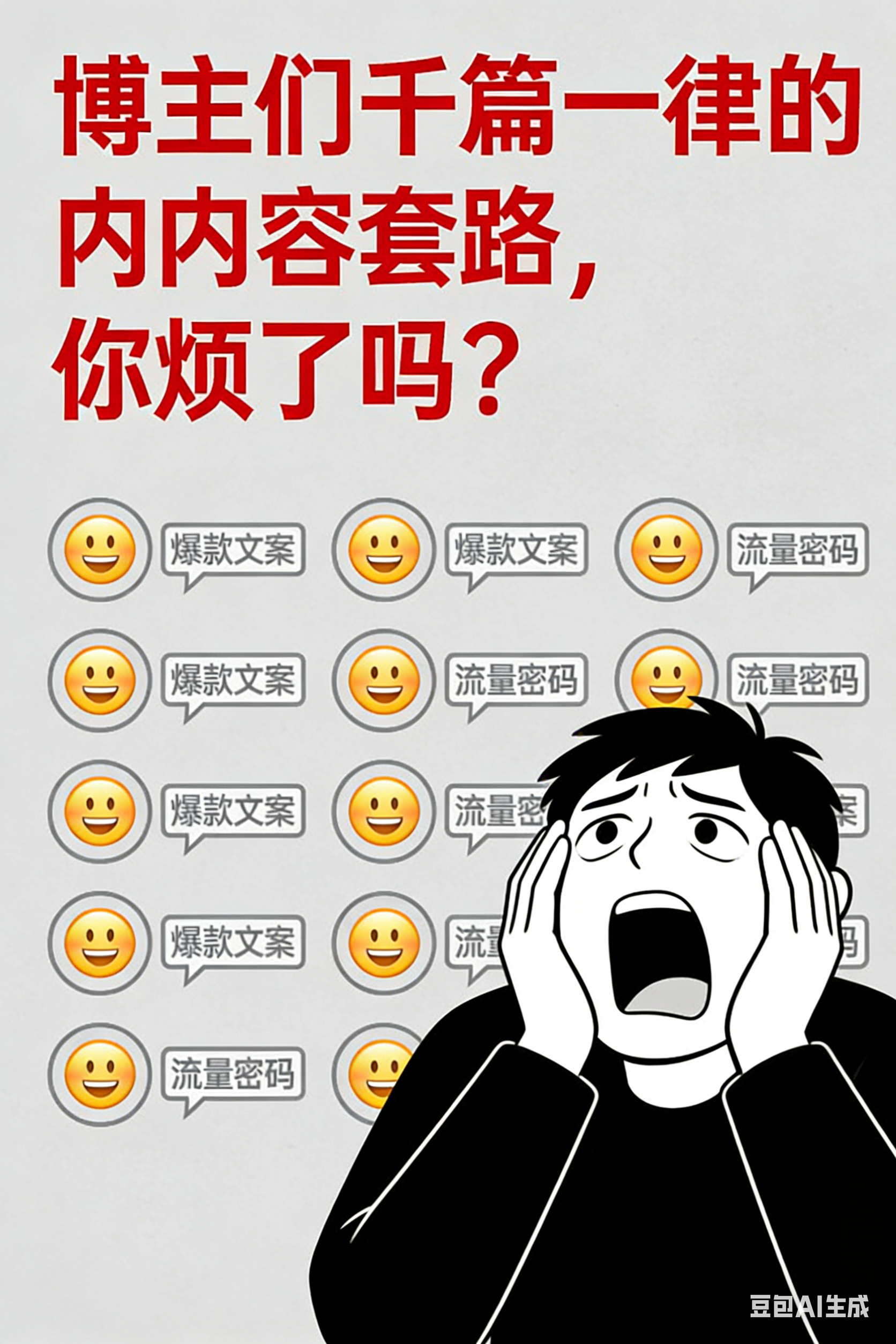 自媒体博主们正在用以下的套路,瓜分观众和读者的注意力:总结和扒同行的内容,发表评论扒名人的播客、采访,然后输出发自己事无巨细的日常,以聊天形式发表有厉害的背书的,视频里常常引用“光辉的过去”做出播放量的,频繁引用涨粉量和播放量没有播放量的,就堆砌努力的数量,比如“爆肝100小时”、“挑战在大街上和100个陌生人搭讪”、“万字长文”博眼球,搞抽象
