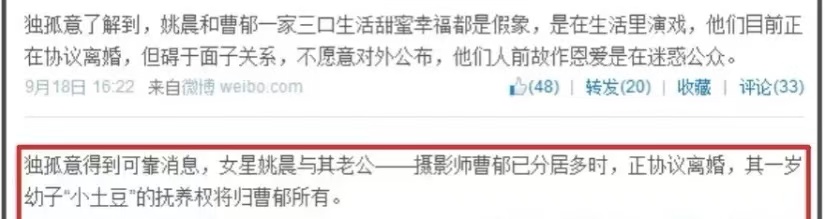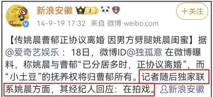 姚晨离婚,和摄影师曹郁双双发联合声明。只是交代了离婚多年,却没有指明到底是在哪一年离的婚。而互联网是有记忆的,很快就有网友扒出,姚晨和曹郁的婚变早在12年前就已经被曝出过。