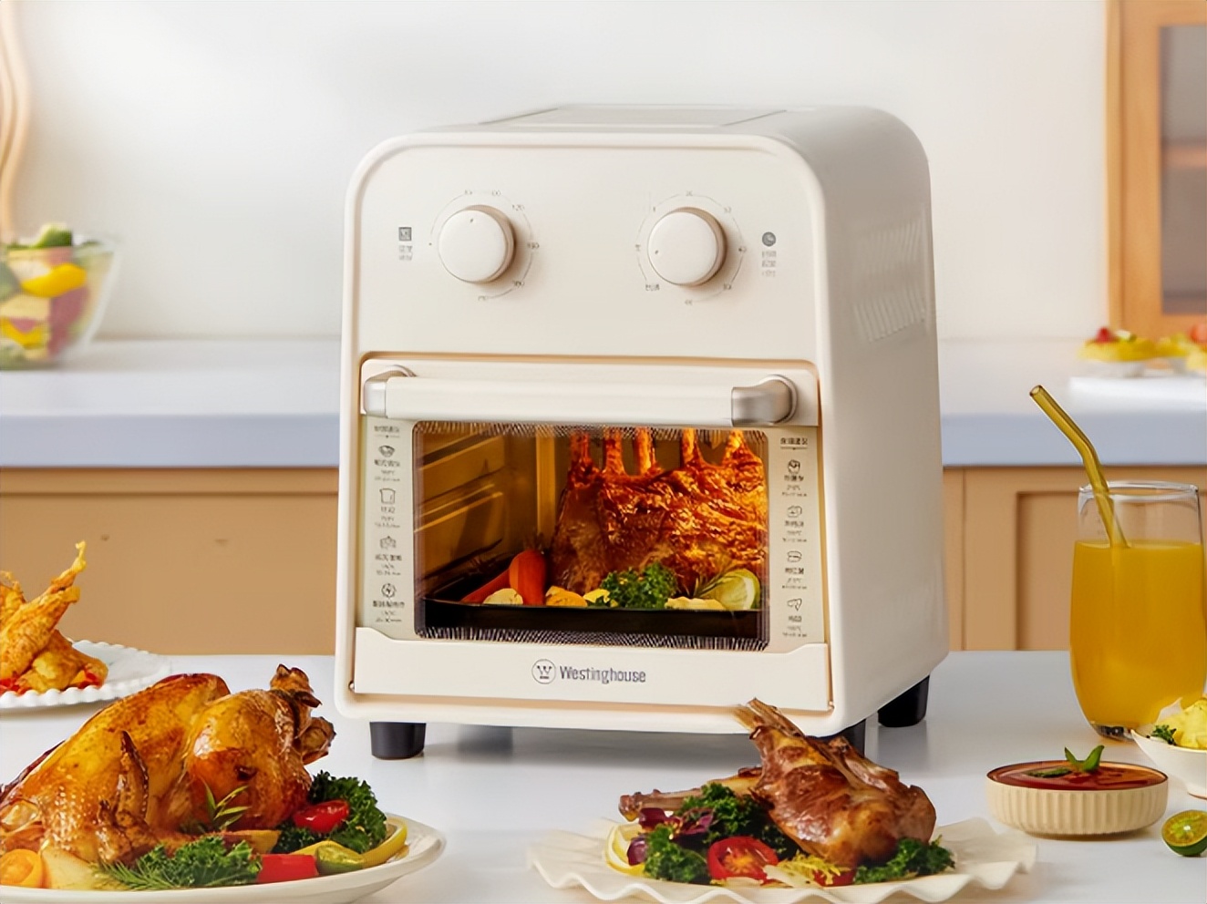 核心构造解析:集成空气炸锅与迷你烤箱功能,提供蒸汽烘焙、一般烘焙、热风烘焙三种模式。配备油水分离漏盘与可视窗口,热风循环设计,外观采用奶油风喷涂工艺。