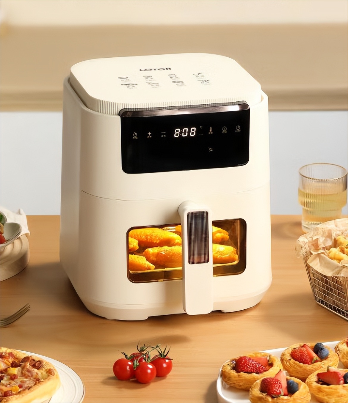 核心构造解析:配备全景可视天窗与双悬浮免翻面技术,机身四方四正便于收纳。热风循环结构可满足薯条、鸡翅等基础食材烹饪。