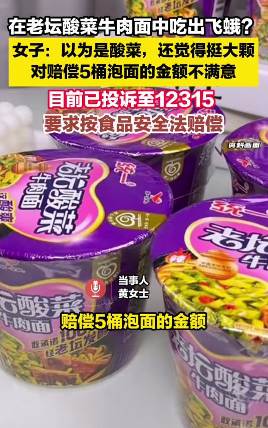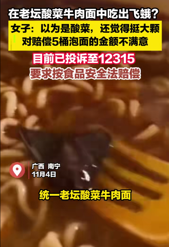 11月5日,广西。女子吐槽统一老坛酸菜牛肉面中吃出一只飞蛾。她称这只飞蛾通体黑黢黢,已与酸菜混为一体,呈现出类似“入味”的颜色和形态,绝非冲泡时不慎落入。