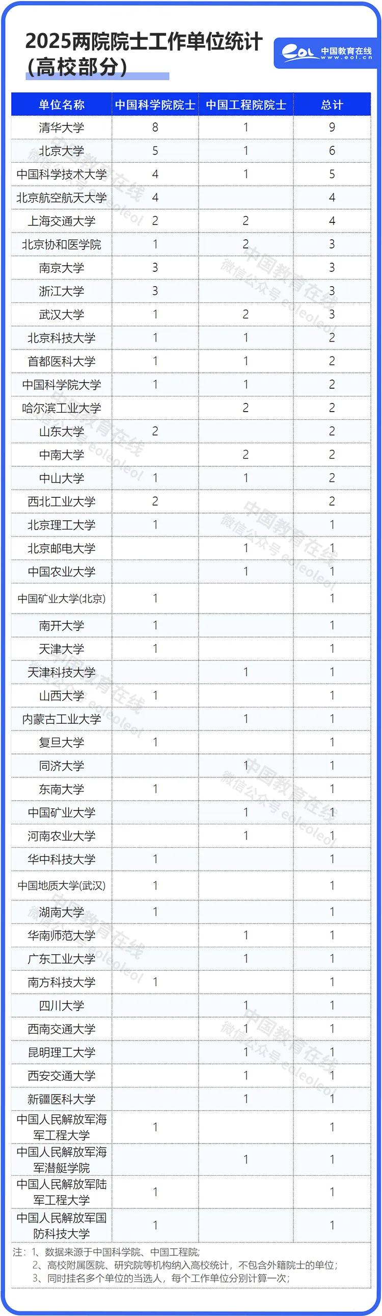 2025年两院增选院士工作单位(高校部分)统计如下(不含外籍院士)